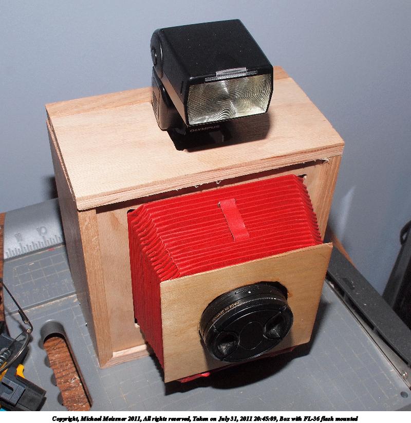 Picture #14: Box with FL-36 flash mounted Small: 800x823, 112,482 bytes (110K), (html file) Large: 2400x2400, 3,858,680 bytes (3.7M), (html file) Copyright, Michael Meissner 2011, All rights reserved Olympus E-P2 camera with Olympus-m43 14-150mm f/4.0-5.6 lens f/8.0, ISO 200, Metz 48 flash (+0.33 flash compensation), 1/60 sec, 16.0mm, aperture priority, vivid color, auto gradation, SHQ, matrix metering, auto + manual focus, IS1 (All Direction Shake IS) 35mm equivalent focal length 32.0mm Extra equipment used: Metz 48 AF-1 Programs used: gimp, raw therapee Taken by Michael Meissner on July 31, 2011 20:45:09 Last modified on July 31, 2011 at 22:48 |
