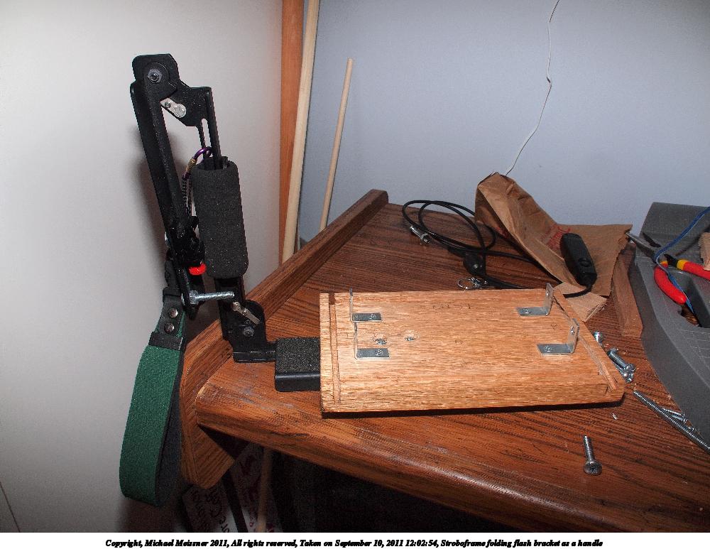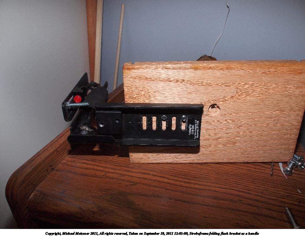 Picture #69: Stroboframe folding flash bracket as a handle Small: 1000x773, 127,623 bytes (125K), (html file) Large: 4000x3000, 3,915,321 bytes (3.7M), (html file) Copyright, Michael Meissner 2011, All rights reserved Olympus E-P2 camera with Olympus-m43 14-150mm f/4.0-5.6 lens f/8.0, ISO 200, FL-36 flash (+0.33 flash compensation), 1/60 sec, 14.0mm, aperture priority, vivid color, auto gradation, SHQ, matrix metering, auto + manual focus, IS1 (All Direction Shake IS), noise reduction auto, noise filter low 35mm equivalent focal length 28.0mm Extra equipment used: Olympus FL-36 flash Programs used: raw therapee Taken by Michael Meissner on September 10, 2011 12:02:54 Last modified on September 12, 2011 at 23:35 |