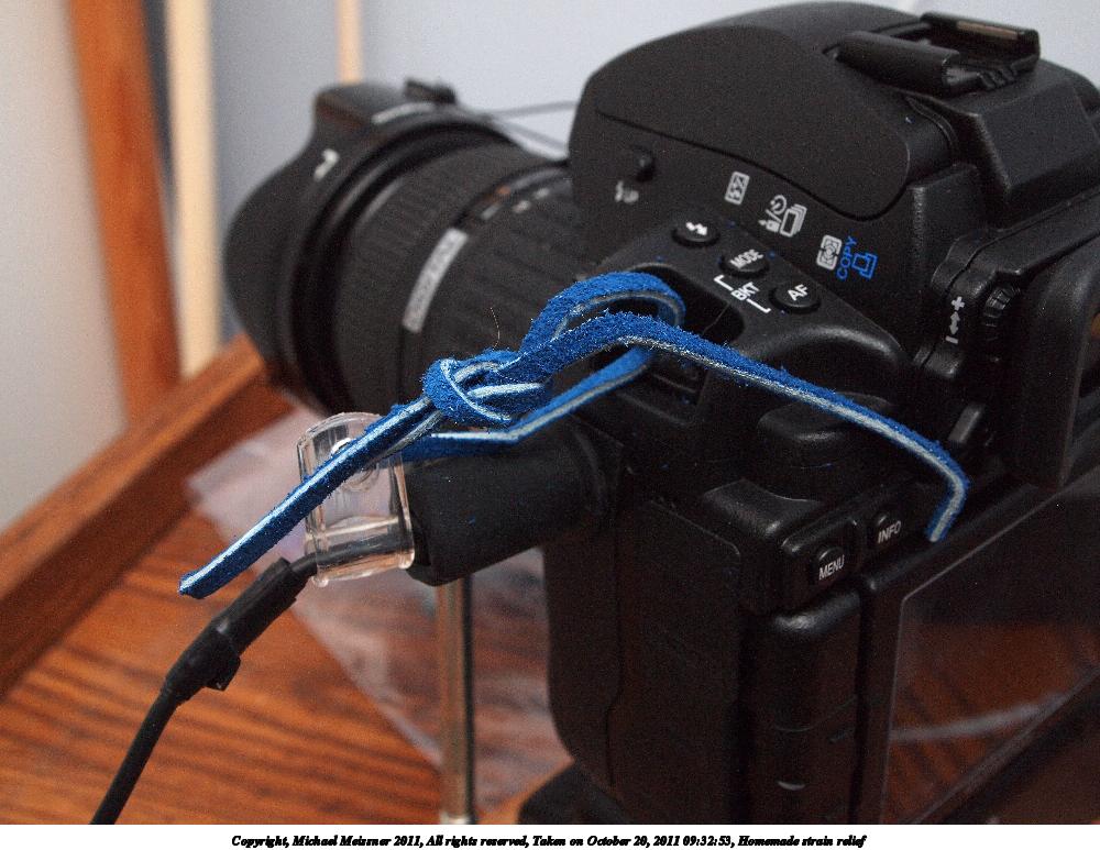 Picture #11: Homemade strain relief Small: 1000x773, 124,031 bytes (122K), (html file) Large: 4000x3000, 10,957,072 bytes (11M), (html file) Copyright, Michael Meissner 2011, All rights reserved Olympus E-P2 camera with Olympus-m43 14-42mm f/3.5-5.6 lens f/8.0, ISO 500, FL-36 flash (+0.33 flash compensation), 1/60 sec, 22.0mm, aperture priority, vivid color, SHQ, matrix metering, IS1 (All Direction Shake IS), noise reduction auto, noise filter low 35mm equivalent focal length 44.0mm Extra equipment used: Olympus FL-36 flash Programs used: gimp Taken by Michael Meissner on October 20, 2011 09:32:53 Last modified on October 20, 2011 at 09:48 After breaking my RM-CB1 shutter release and two clones in the box used in the Great New England Steampunk Exhibition, in addition to making a wider box, I decided to make a homemade strain relief. I took a rubber sleeve I got from an electronics store, and cut it down to size. I took a plastic clip for mounting wiring and put it after the rubber sleeve, and used some electrical tape to prevent it from moving. Finally, I took some leather lacing and tied it to the camera strap holder on the camera. It may not survive strong yanks, but hopefully it will prevent future breaks to the shutter release cable. |
