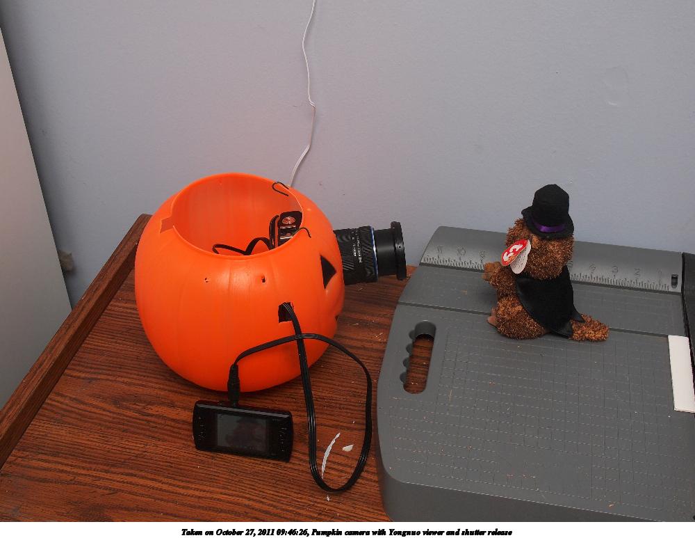 Picture #4: Pumpkin camera with Yongnuo viewer and shutter release Small: 1000x773, 94,451 bytes (93K), (html file) Large: 4000x3000, 3,367,887 bytes (3.2M), (html file) Olympus E-5 camera with Olympus 14-54mm f/2.8-3.5 lens f/8.0, ISO 200, Metz 48 flash, 1/60 sec, 23.0mm, aperture priority, vivid color, matrix metering, IS1 (All Direction Shake IS) 35mm equivalent focal length 46.0mm Extra equipment used: Metz 48 flash Programs used: adjusttime, raw therapee Taken by Michael Meissner on October 27, 2011 09:46:26 Last modified on November 06, 2011 at 18:52 |