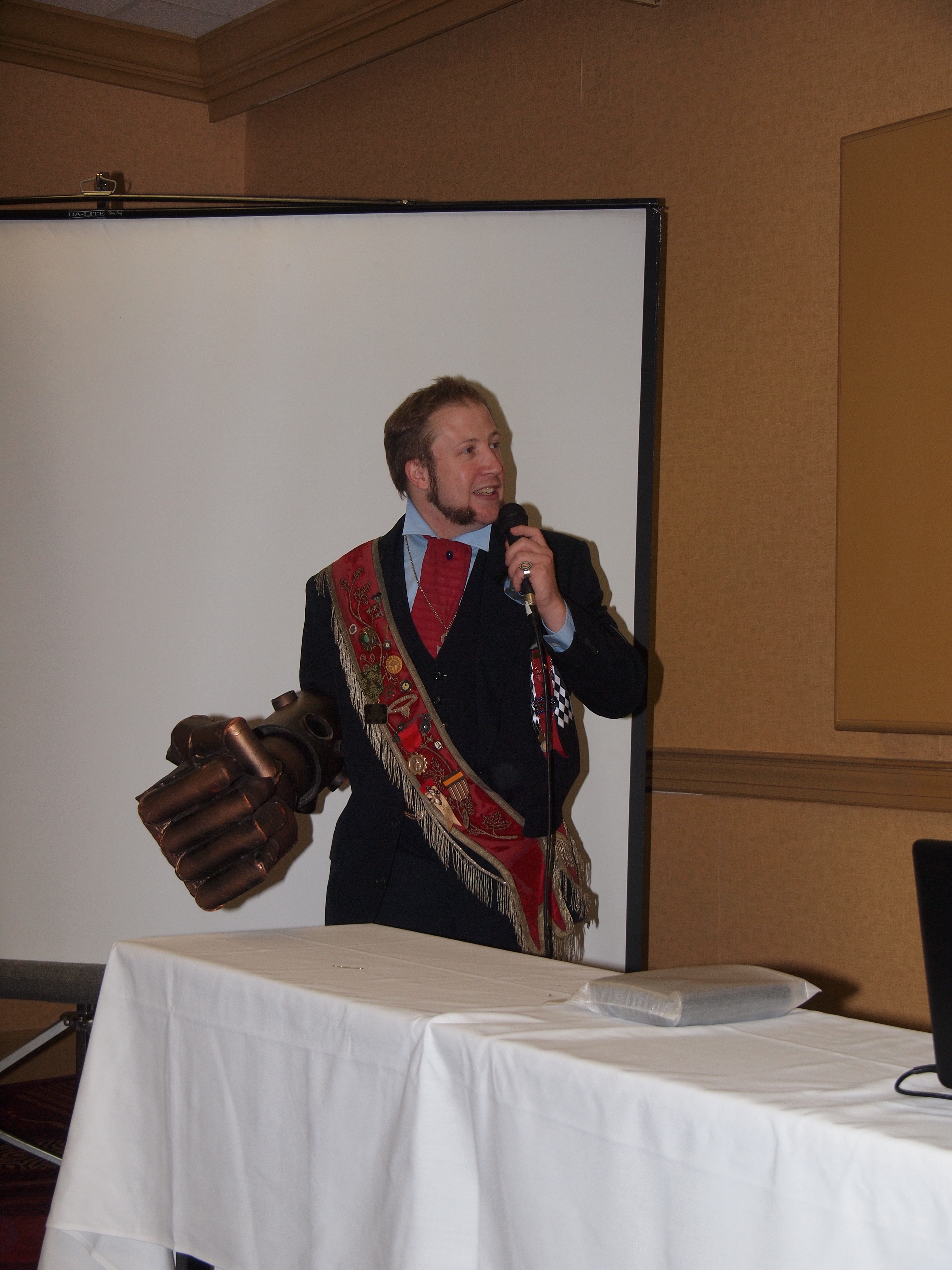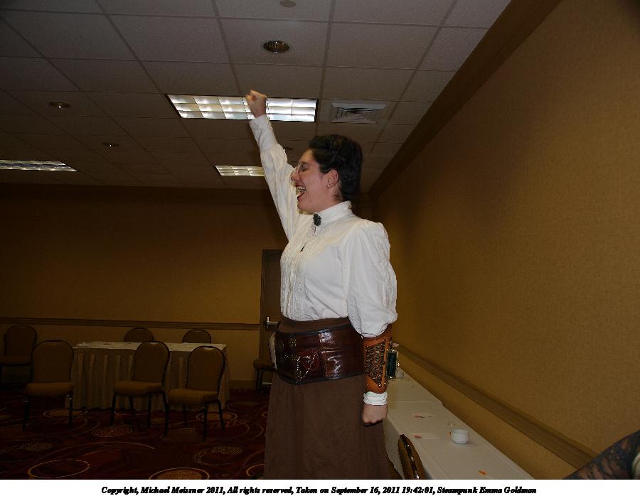 Picture #74: Steampunk Emma Goldman Small: 900x698, 69,894 bytes (69K), (html file) Large: 3600x2700, 2,290,601 bytes (2.2M), (html file) Copyright, Michael Meissner 2011, All rights reserved Olympus E-3 camera with Olympus 14-54mm f/2.8-3.5 lens f/2.8, ISO 100, Metz 48 flash (+0.3 flash compensation), 1/60 sec, 14.0mm, auto mode, vivid color, SHQ, matrix metering, noise filter low 35mm equivalent focal length 28.0mm Extra equipment used: Metz 48 flash Programs used: raw therapee Taken by Michael Meissner on September 16, 2011 19:42:01 Last modified on January 01, 2012 at 01:02 |