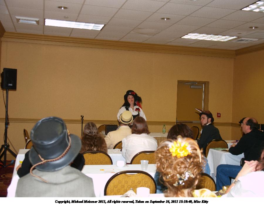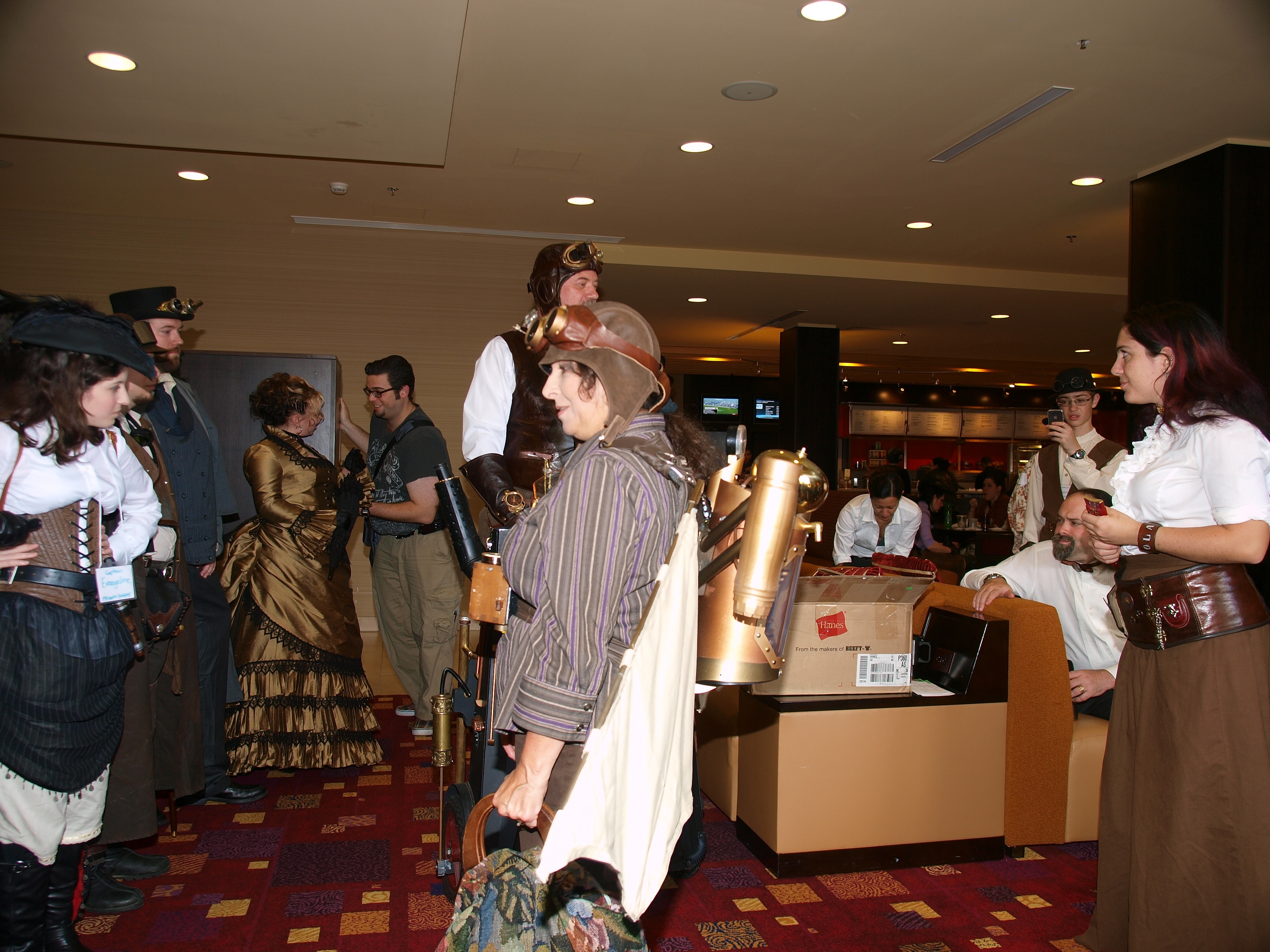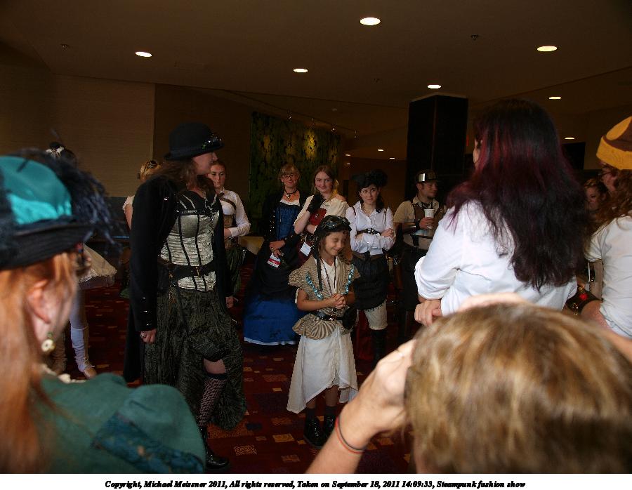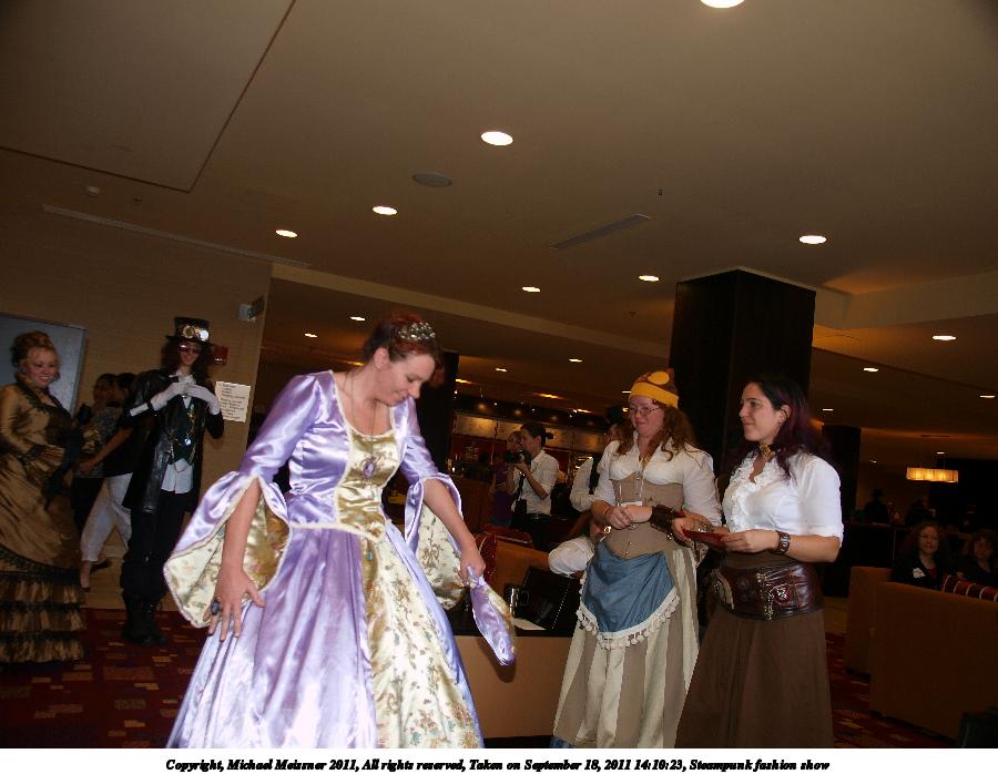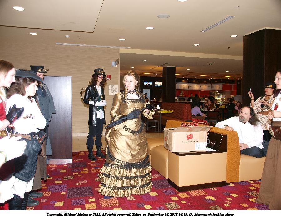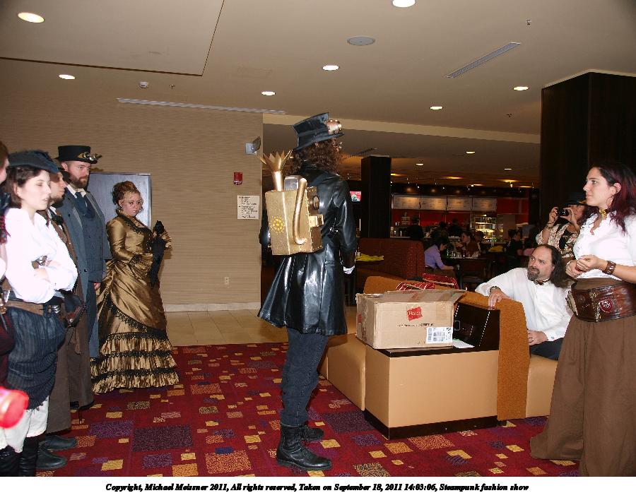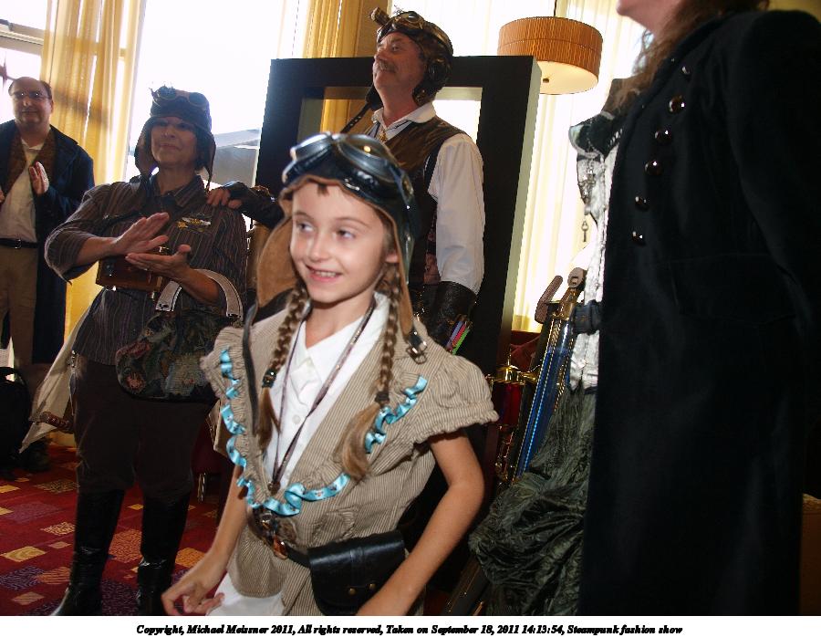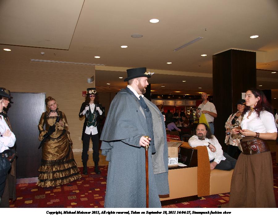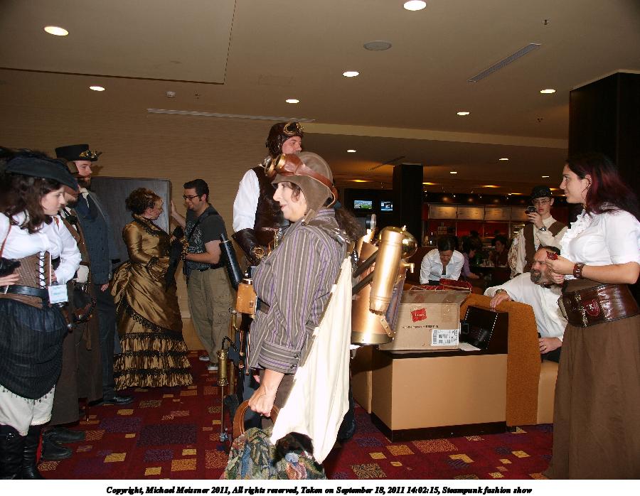 Picture #10: Steampunk fashion show Small: 900x698, 116,318 bytes (114K), (html file) Large: 3600x2700, 2,744,867 bytes (2.6M), (html file) Copyright, Michael Meissner 2011, All rights reserved Olympus E-3 camera with Olympus 14-54mm f/2.8-3.5 lens f/2.8, ISO 100, Metz 48 flash (+0.3 flash compensation), 1/60 sec, 14.0mm, auto mode, vivid color, SHQ, matrix metering, noise filter low 35mm equivalent focal length 28.0mm Extra equipment used: Metz 48 flash Programs used: raw therapee Taken by Michael Meissner on September 18, 2011 14:02:15 Last modified on January 02, 2012 at 16:46 |