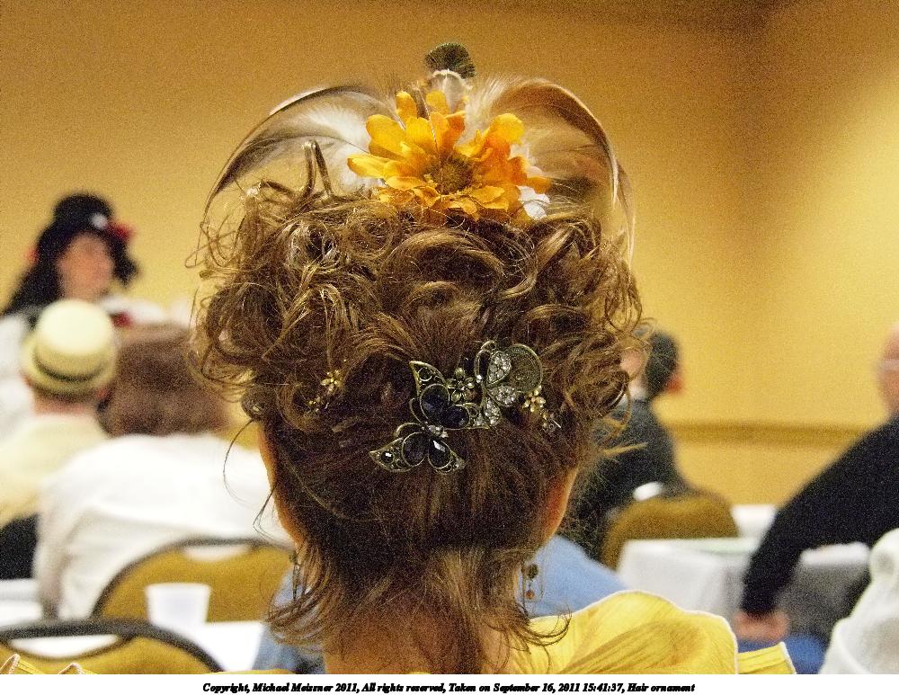 Picture #117: Hair ornament Small: 1000x773, 188,575 bytes (185K), (html file) Large: 4000x3000, 5,547,349 bytes (5.3M), (html file) Copyright, Michael Meissner 2011, All rights reserved Olympus E-P2 camera with Olympus-m43 14-150mm f/4.0-5.6 lens f/5.3, ISO 3200, 1/50 sec, 39.0mm, auto mode, vivid color, auto gradation, SHQ, matrix metering, auto + manual focus, IS1 (All Direction Shake IS), noise reduction auto, noise filter low 35mm equivalent focal length 78.0mm Programs used: raw therapee Taken by Michael Meissner on September 16, 2011 15:41:37 Last modified on December 29, 2011 at 00:29 |