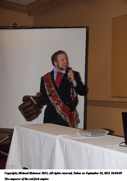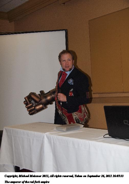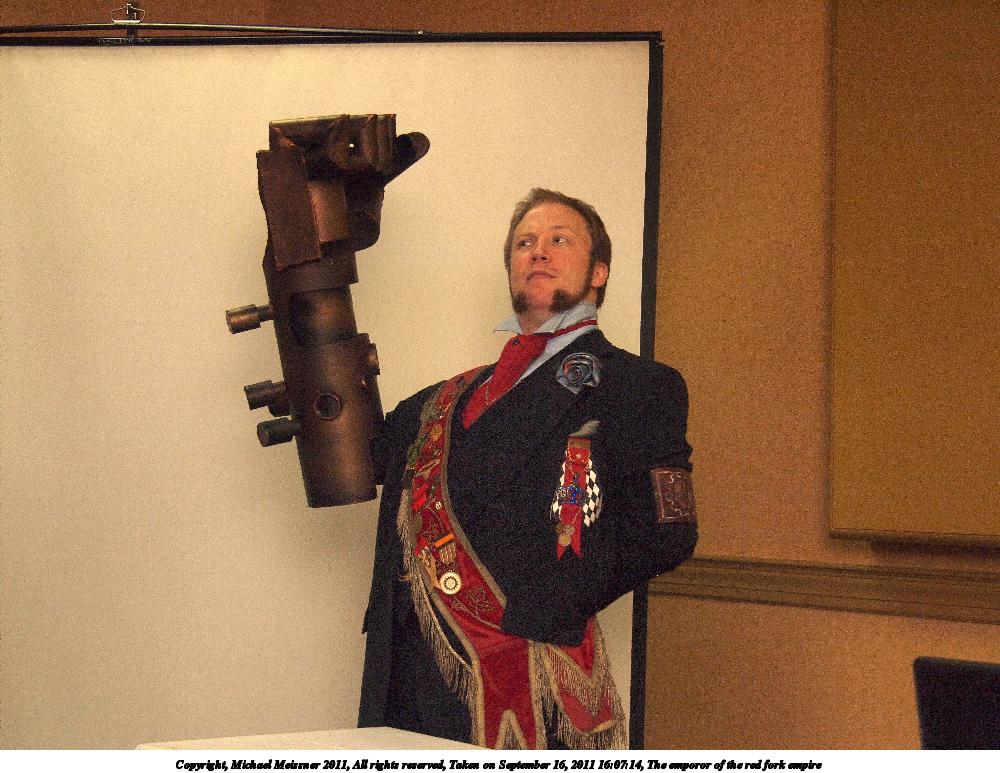 Picture #112: The emporor of the red fork empire #2 Small: 1000x773, 158,814 bytes (156K), (html file) Large: 4000x3000, 5,472,366 bytes (5.2M), (html file) Copyright, Michael Meissner 2011, All rights reserved Olympus E-P2 camera with Olympus-m43 14-150mm f/4.0-5.6 lens f/5.1, ISO 320, FL-36 flash (+0.33 flash compensation), 1/60 sec, 34.0mm, auto mode, vivid color, auto gradation, SHQ, matrix metering, auto + manual focus, IS1 (All Direction Shake IS), noise reduction auto, noise filter low 35mm equivalent focal length 68.0mm Extra equipment used: Olympus FL-36 flash Programs used: raw therapee Taken by Michael Meissner on September 16, 2011 16:07:14 Last modified on December 29, 2011 at 00:31 |