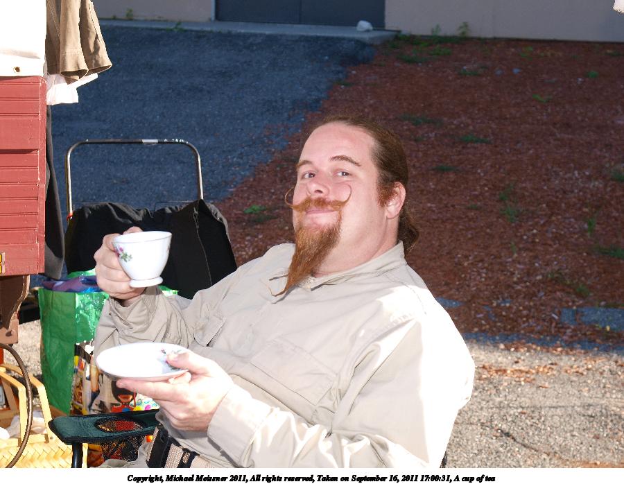 Picture #109: A cup of tea Small: 900x698, 110,632 bytes (109K), (html file) Large: 3600x2700, 2,506,239 bytes (2.4M), (html file) Copyright, Michael Meissner 2011, All rights reserved Olympus E-3 camera with Olympus 14-54mm f/2.8-3.5 lens f/4.5, ISO 100, Metz 48 flash (+0.3 flash compensation), 1/160 sec, 38.0mm, auto mode, vivid color, SHQ, matrix metering, noise filter low 35mm equivalent focal length 76.0mm Extra equipment used: Metz 48 flash Programs used: raw therapee Taken by Michael Meissner on September 16, 2011 17:00:31 Last modified on January 01, 2012 at 00:28 |