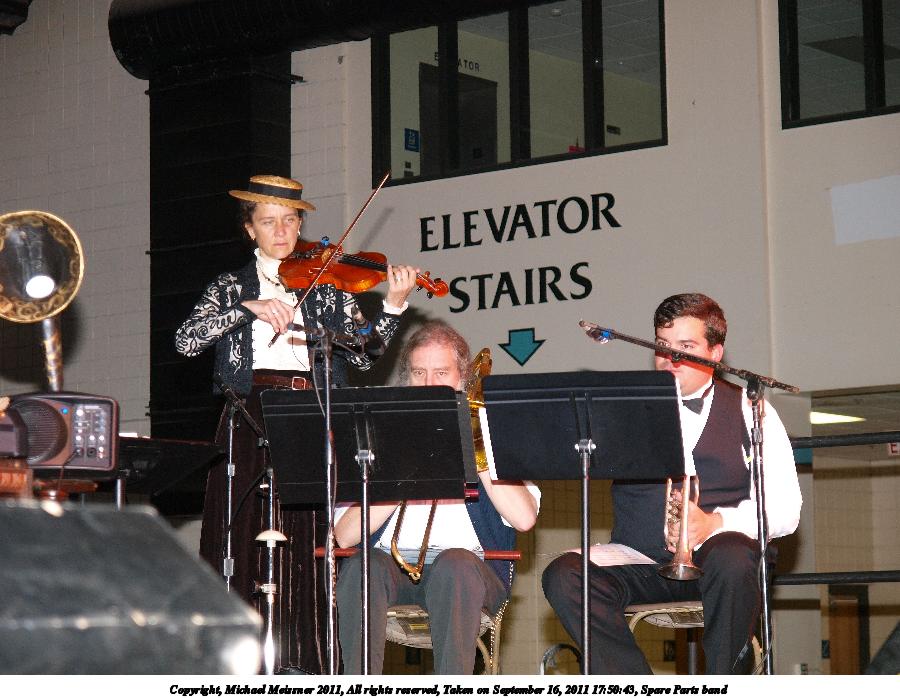 Picture #89: Spare Parts band #6 Small: 900x698, 62,939 bytes (62K), (html file) Large: 3600x2700, 1,994,562 bytes (1.9M), (html file) Copyright, Michael Meissner 2011, All rights reserved Olympus E-3 camera with Olympus 14-54mm f/2.8-3.5 lens f/3.5, ISO 100, Metz 48 flash (+0.3 flash compensation), 1/100 sec, 54.0mm, auto mode, vivid color, SHQ, matrix metering, noise filter low 35mm equivalent focal length 108.0mm Extra equipment used: Metz 48 flash Programs used: raw therapee Taken by Michael Meissner on September 16, 2011 17:50:30 Last modified on January 01, 2012 at 00:45 |