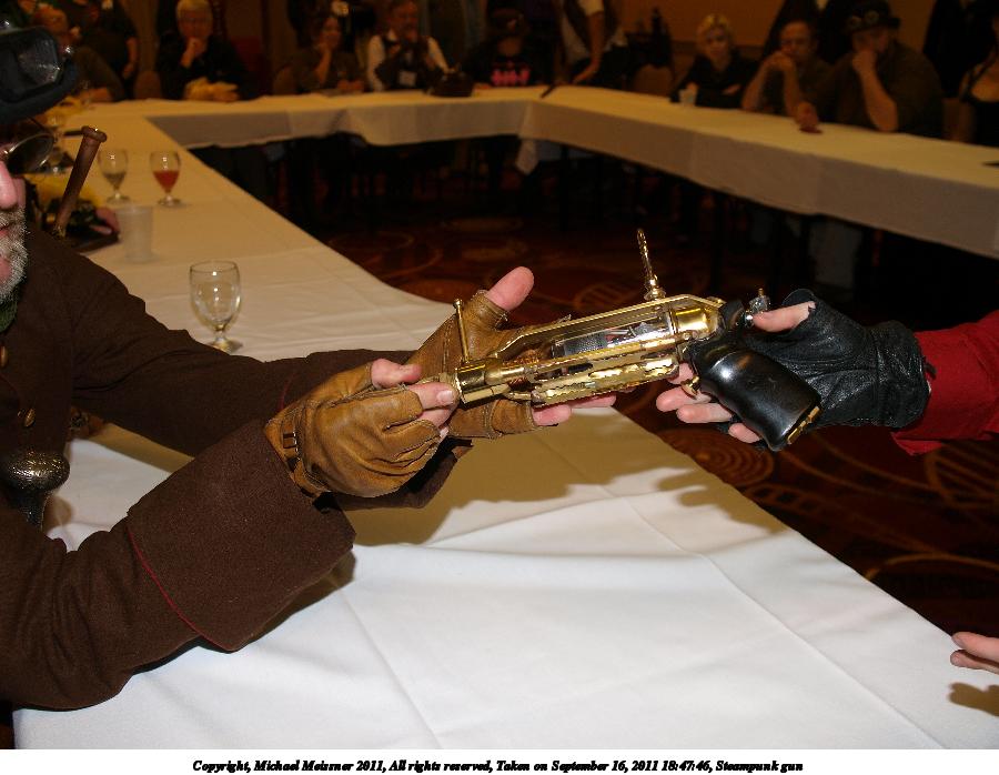 Picture #81: Steampunk gun Small: 900x698, 86,568 bytes (85K), (html file) Large: 3600x2700, 2,287,582 bytes (2.2M), (html file) Copyright, Michael Meissner 2011, All rights reserved Olympus E-3 camera with Olympus 14-54mm f/2.8-3.5 lens f/2.9, ISO 100, Metz 48 flash (+0.3 flash compensation), 1/60 sec, 19.0mm, auto mode, vivid color, SHQ, matrix metering, noise filter low 35mm equivalent focal length 38.0mm Extra equipment used: Metz 48 flash Programs used: raw therapee Taken by Michael Meissner on September 16, 2011 18:47:46 Last modified on January 01, 2012 at 00:49 |