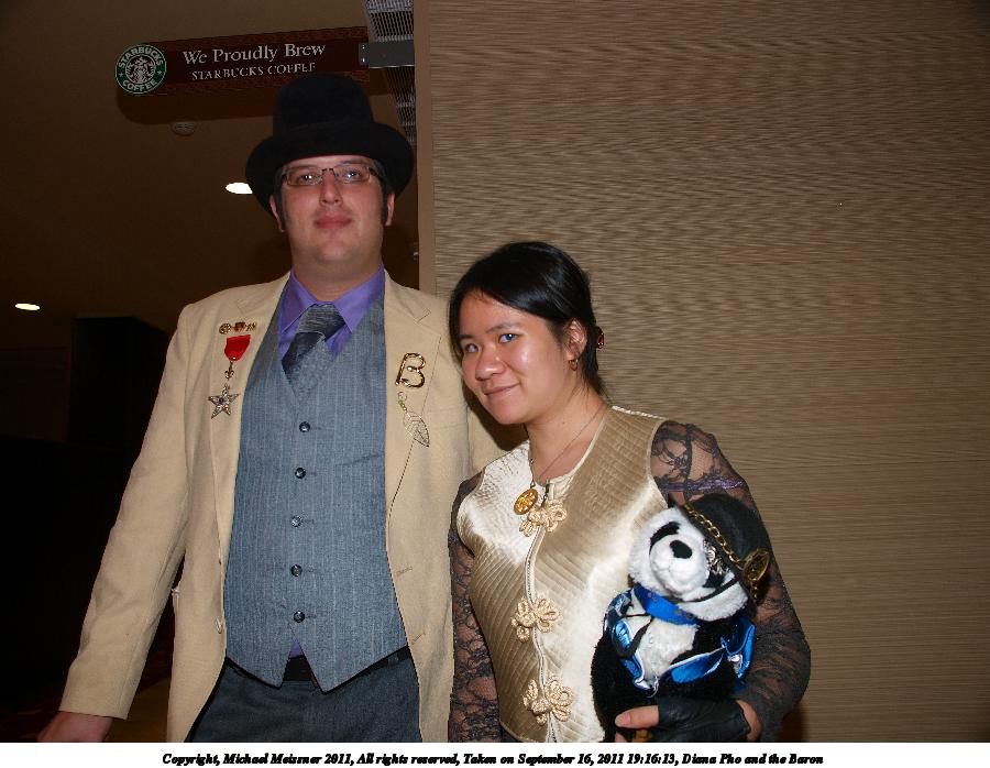 Picture #79: Diana Pho and the Baron Small: 900x698, 105,502 bytes (104K), (html file) Large: 3600x2700, 2,810,261 bytes (2.7M), (html file) Copyright, Michael Meissner 2011, All rights reserved Olympus E-3 camera with Olympus 14-54mm f/2.8-3.5 lens f/2.8, ISO 100, Metz 48 flash (+0.3 flash compensation), 1/60 sec, 14.0mm, auto mode, vivid color, SHQ, matrix metering, noise filter low 35mm equivalent focal length 28.0mm Extra equipment used: Metz 48 flash Programs used: raw therapee Taken by Michael Meissner on September 16, 2011 19:16:13 Last modified on January 01, 2012 at 01:00 |