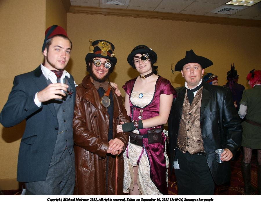 Picture #77: Steampunker people Small: 900x698, 118,067 bytes (116K), (html file) Large: 3600x2700, 2,959,527 bytes (2.8M), (html file) Copyright, Michael Meissner 2011, All rights reserved Olympus E-3 camera with Olympus 14-54mm f/2.8-3.5 lens f/2.8, ISO 100, Metz 48 flash (+0.3 flash compensation), 1/60 sec, 14.0mm, auto mode, vivid color, SHQ, matrix metering, noise filter low 35mm equivalent focal length 28.0mm Extra equipment used: Metz 48 flash Programs used: raw therapee Taken by Michael Meissner on September 16, 2011 19:40:24 Last modified on January 01, 2012 at 01:01 |