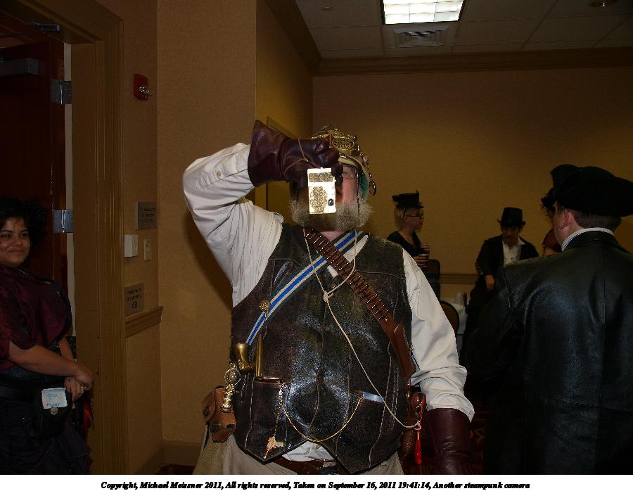 Picture #76: Another steampunk camera Small: 900x698, 92,496 bytes (91K), (html file) Large: 3600x2700, 2,629,589 bytes (2.5M), (html file) Copyright, Michael Meissner 2011, All rights reserved Olympus E-3 camera with Olympus 14-54mm f/2.8-3.5 lens f/2.8, ISO 100, Metz 48 flash (+0.3 flash compensation), 1/60 sec, 14.0mm, auto mode, vivid color, SHQ, matrix metering, noise filter low 35mm equivalent focal length 28.0mm Extra equipment used: Metz 48 flash Programs used: raw therapee Taken by Michael Meissner on September 16, 2011 19:41:14 Last modified on January 01, 2012 at 01:01 |