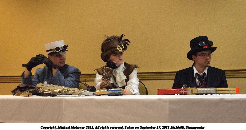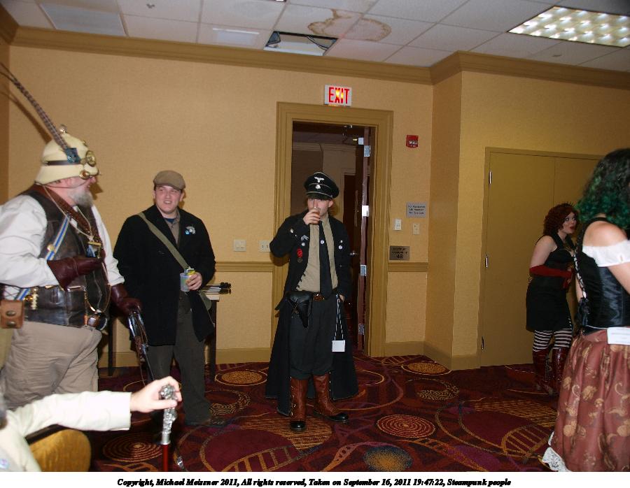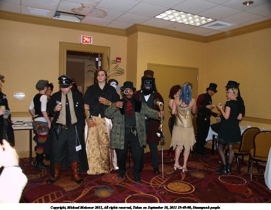 Picture #71: Steampunk people #2 Small: 900x698, 113,441 bytes (111K), (html file) Large: 3600x2700, 2,685,178 bytes (2.6M), (html file) Copyright, Michael Meissner 2011, All rights reserved Olympus E-3 camera with Olympus 14-54mm f/2.8-3.5 lens f/2.8, ISO 100, Metz 48 flash (+0.3 flash compensation), 1/60 sec, 14.0mm, auto mode, vivid color, SHQ, matrix metering, noise filter low 35mm equivalent focal length 28.0mm Extra equipment used: Metz 48 flash Programs used: raw therapee Taken by Michael Meissner on September 16, 2011 19:49:00 Last modified on January 01, 2012 at 01:03 |