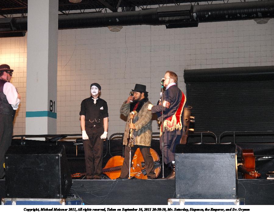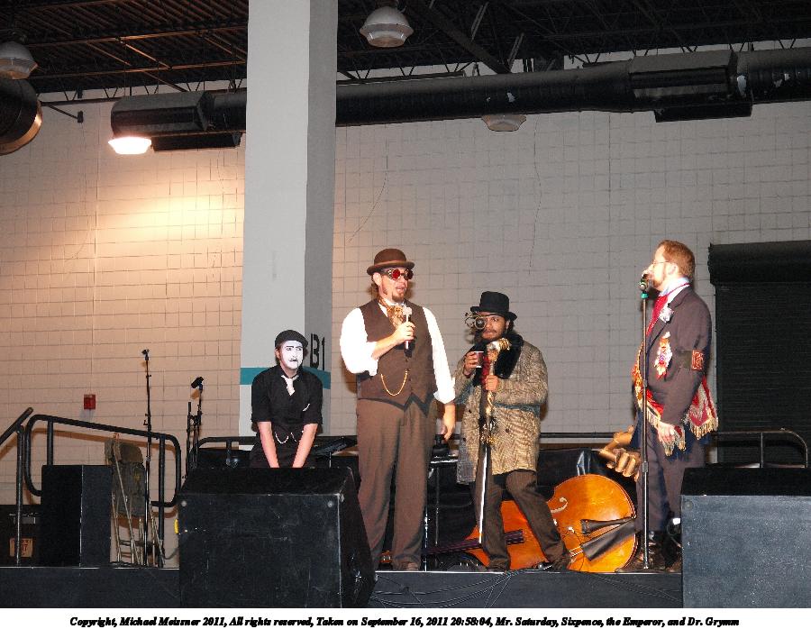 Picture #63: Mr. Saturday, Sixpence, the Emperor, and Dr. Grymm #2 Small: 900x698, 115,278 bytes (113K), (html file) Large: 3600x2700, 3,341,044 bytes (3.2M), (html file) Copyright, Michael Meissner 2011, All rights reserved Olympus E-3 camera with Olympus 14-54mm f/2.8-3.5 lens f/3.4, ISO 500, Metz 48 flash (+0.3 flash compensation), 1/80 sec, 45.0mm, auto mode, vivid color, SHQ, matrix metering, noise filter low 35mm equivalent focal length 90.0mm Extra equipment used: Metz 48 flash Programs used: raw therapee Taken by Michael Meissner on September 16, 2011 20:58:10 Last modified on January 01, 2012 at 01:07 |
