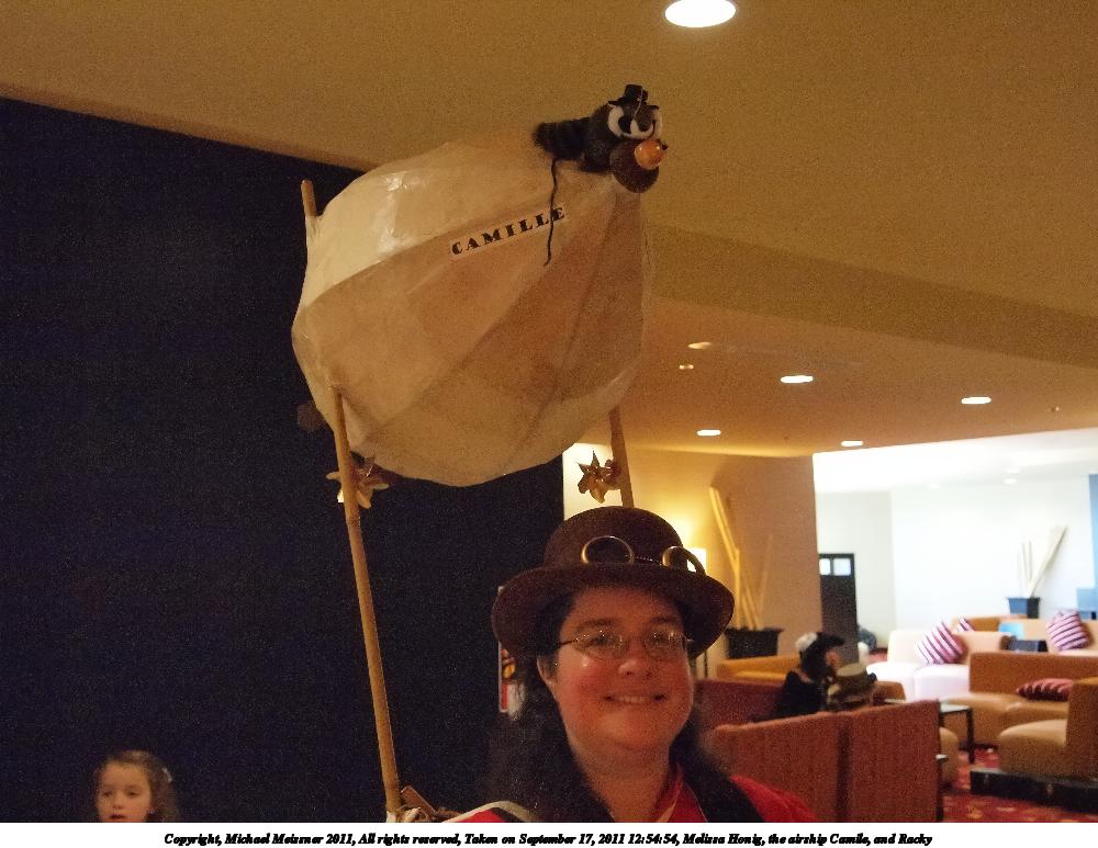 Picture #25: Melissa Honig, the airship Camile, and Racky Small: 1000x773, 115,051 bytes (113K), (html file) Large: 4000x3000, 5,616,404 bytes (5.4M), (html file) Copyright, Michael Meissner 2011, All rights reserved Olympus E-P2 camera with Olympus-m43 14-42mm f/3.5-5.6 lens f/4.2, ISO 2500, 1/60 sec, 22.0mm, auto mode, vivid color, auto gradation, SHQ, matrix metering, auto + manual focus, IS1 (All Direction Shake IS), noise reduction auto, noise filter low 35mm equivalent focal length 44.0mm Programs used: NoiseNinja, rawtherapee Taken by Michael Meissner on September 17, 2011 12:54:54 Last modified on January 01, 2012 at 22:22 |