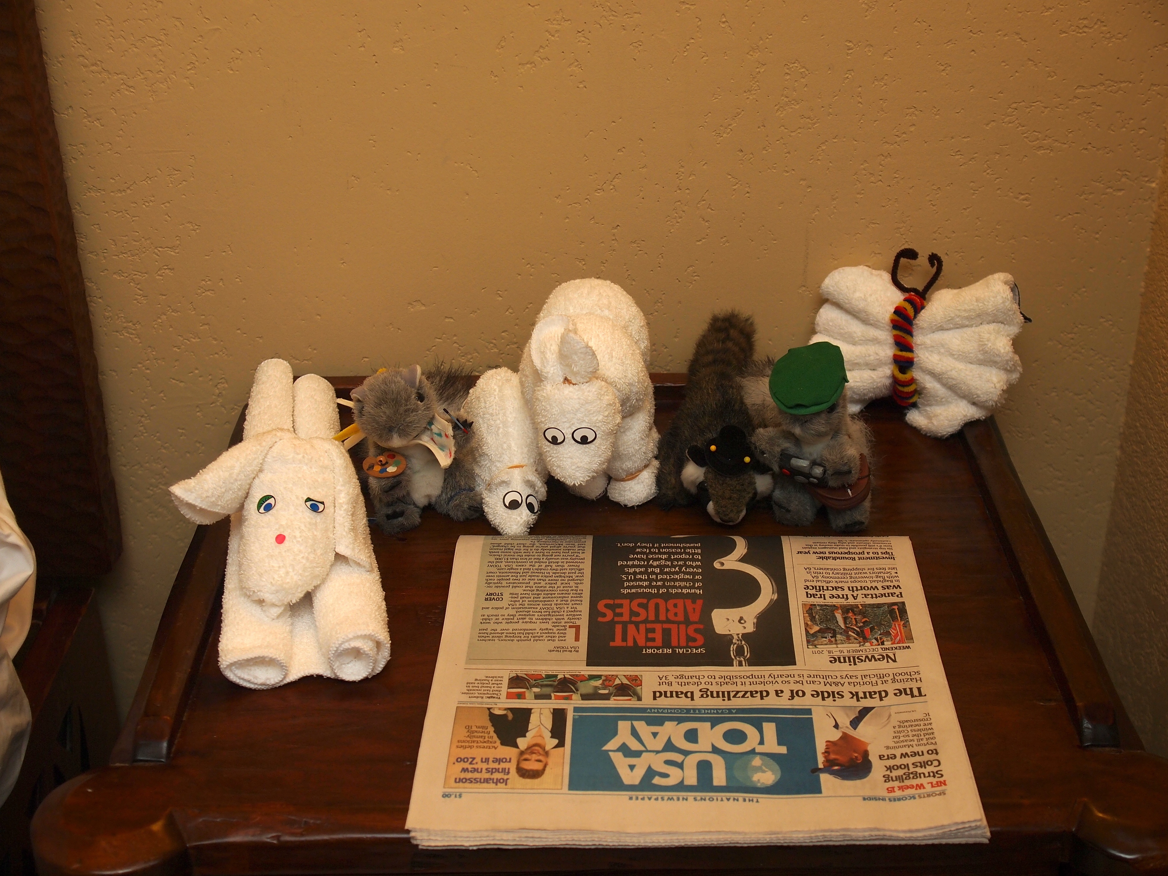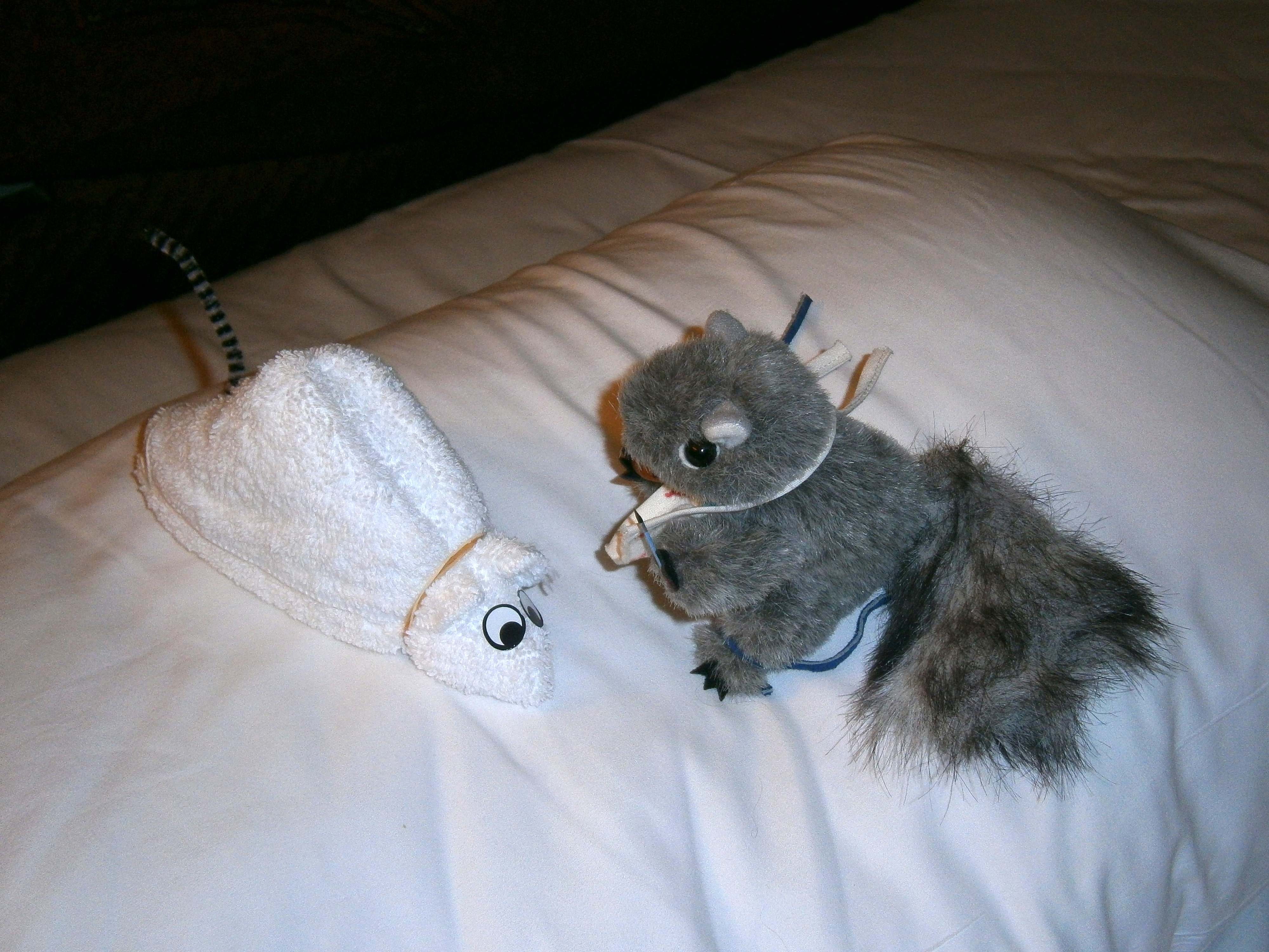 Picture #111: Towel animals meet the stuffed animals #2 Small: 1000x773, 130,095 bytes (128K), (html file) Large: 4000x3000, 3,734,666 bytes (3.6M), (html file) Copyright, Michael Meissner 2011, All rights reserved Olympus E-5 camera with Olympus 14-54mm f/2.8-3.5 lens f/3.1, ISO 200, Metz 48 flash, 1/60 sec, 25.0mm, auto mode, vivid color, matrix metering, IS1 (All Direction Shake IS) 35mm equivalent focal length 50.0mm Programs used: adjusttime, raw therapee Taken by Michael Meissner on December 18, 2011 09:16:29 Last modified on February 09, 2012 at 00:14 This picture is one of my favorites. |