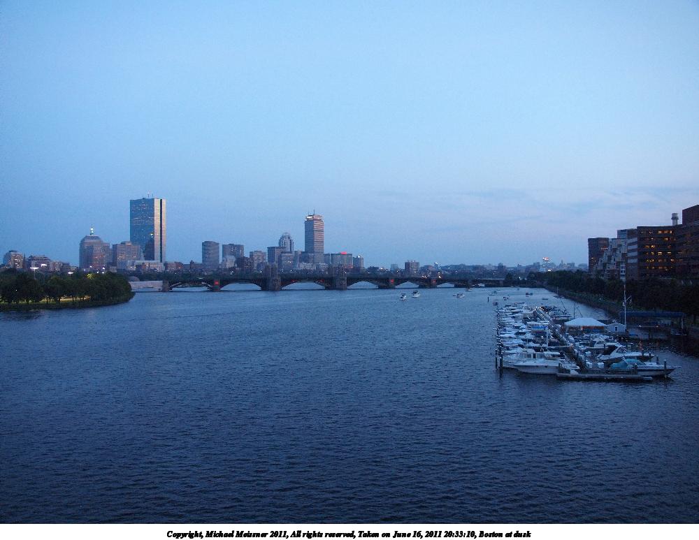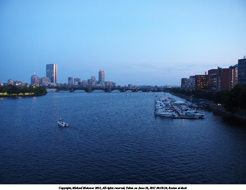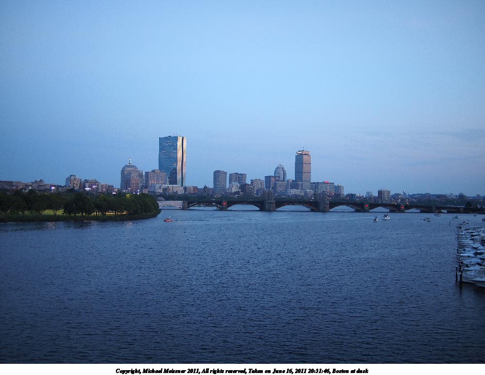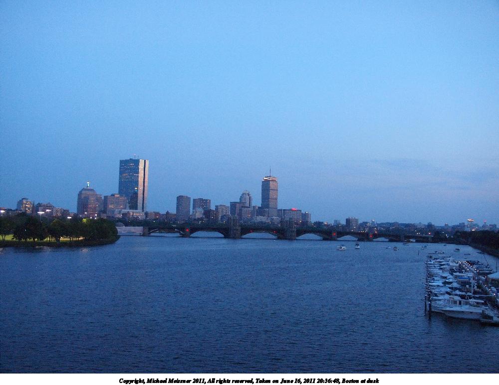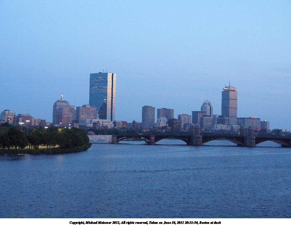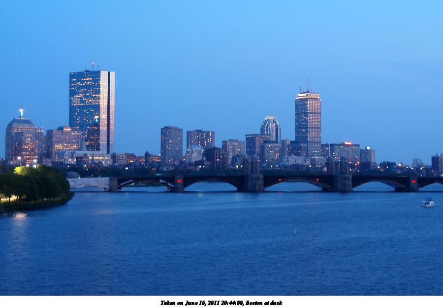 Picture #2: Boston at dusk #9 900x473, 63,916 bytes (63K), (html file) Olympus E-P2 camera with Olympus-m43 14-150mm f/4.0-5.6 lens f/4.9, ISO 200, 0.6 sec, 29.0mm, auto mode, vivid color, SHQ, matrix metering, auto + manual focus, IS1 (All Direction Shake IS) 35mm equivalent focal length 58.0mm Programs used: gimp, raw therapee Taken by Michael Meissner on June 16, 2011 20:46:14 Last modified on August 28, 2011 at 11:05 This picture is one of my favorites. |
