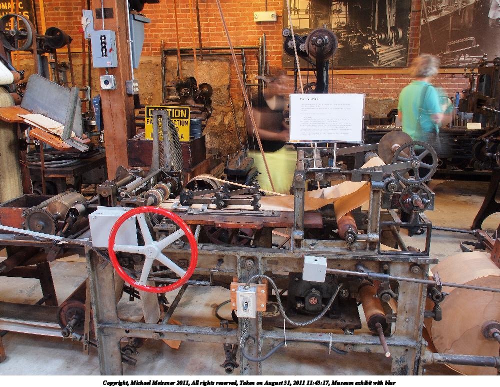 Picture #10: Museum exhibit with blur Thumb: 500x375, 62,846 bytes (62K) Small: 1000x773, 212,093 bytes (208K), (html file) Copyright, Michael Meissner 2011, All rights reserved Olympus E-P2 camera with Olympus-m43 14-150mm f/4.0-5.6 lens f/8.0, ISO 200, 1 sec, 15.0mm, aperture priority, vivid color, auto gradation, SHQ, matrix metering, auto + manual focus, IS1 (All Direction Shake IS) 35mm equivalent focal length 30.0mm Extra equipment used: tripod Programs used: raw therapee Taken by Michael Meissner on August 31, 2011 11:43:17 Last modified on October 21, 2011 at 08:48 |