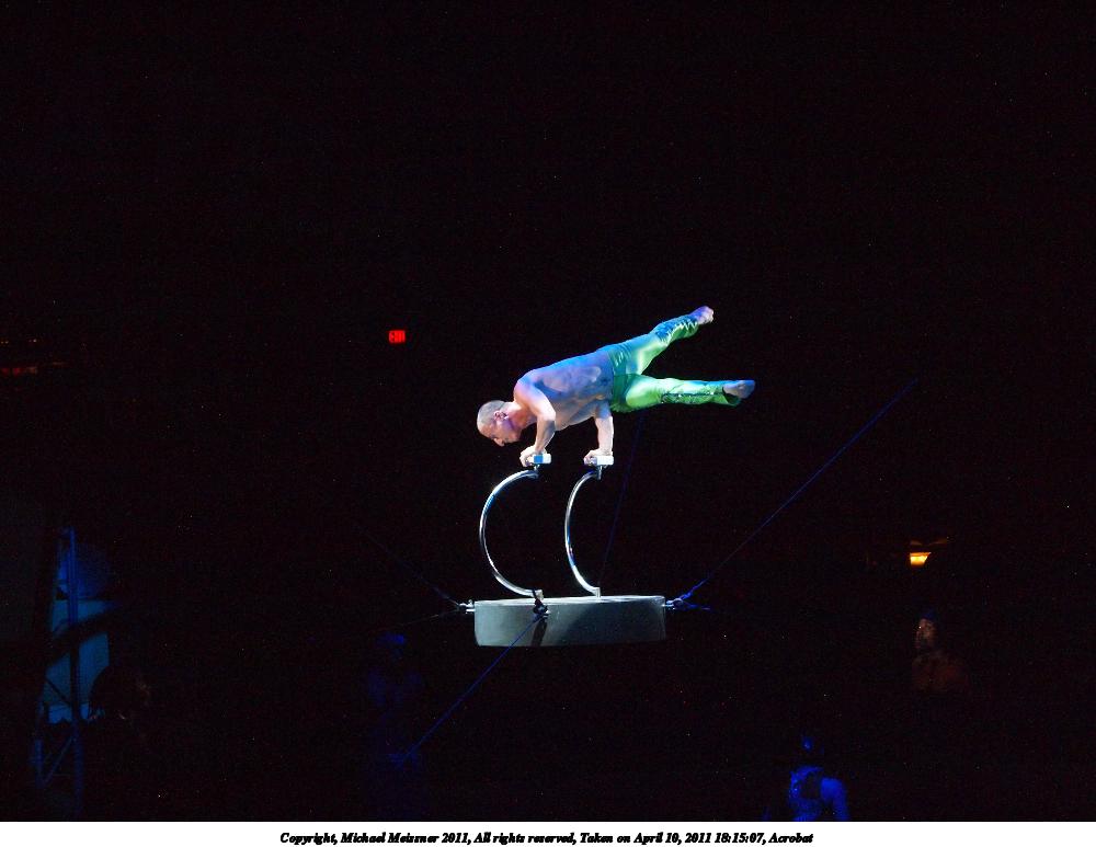 Picture #61: Acrobat #3 1000x773, 107,862 bytes (106K), (html file) Copyright, Michael Meissner 2011, All rights reserved Olympus E-P2 camera with Olympus-m43 14-42mm f/3.5-5.6 lens f/5.4, ISO 3200, 1/60 sec, 38.0mm, auto mode, vivid color, spot metering, IS1 (All Direction Shake IS), noise reduction auto 35mm equivalent focal length 76.0mm Programs used: noiseninja, raw therapee Taken by Michael Meissner on April 10, 2011 18:19:38 Last modified on April 13, 2011 at 07:50 |
