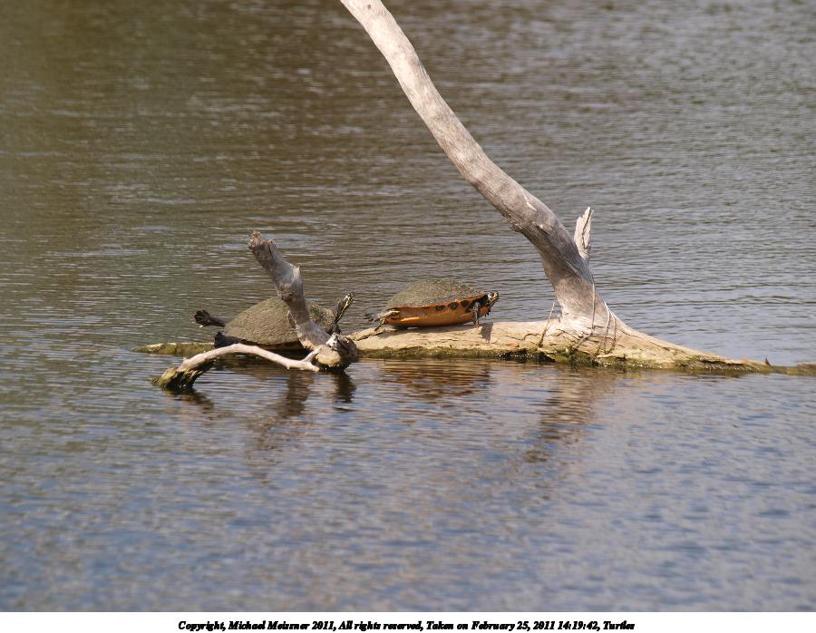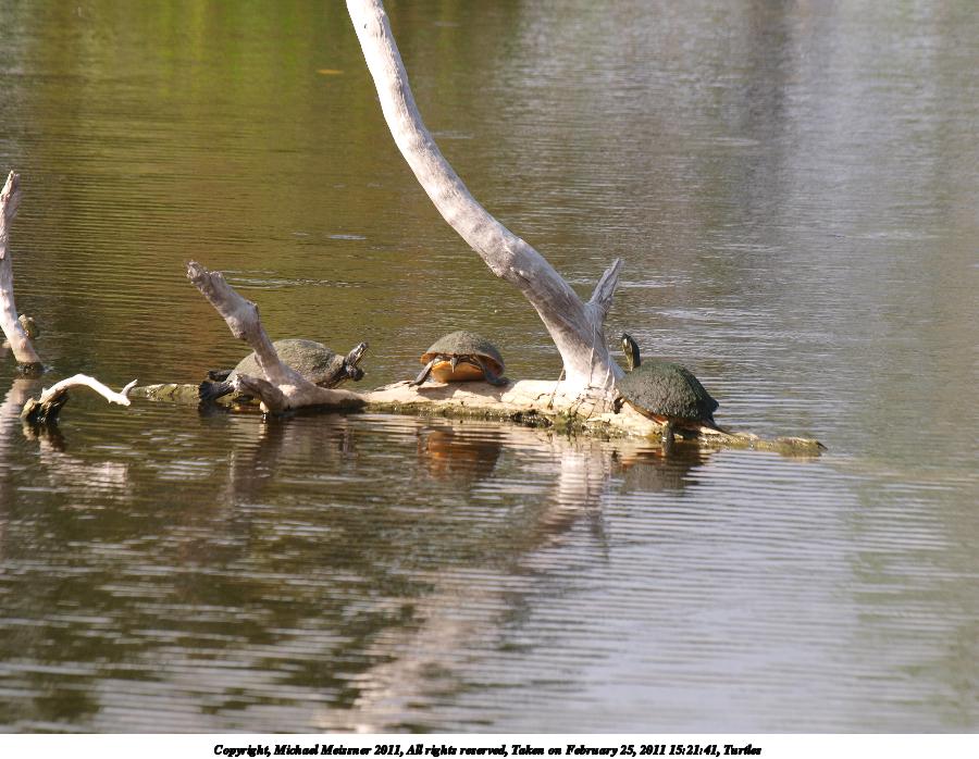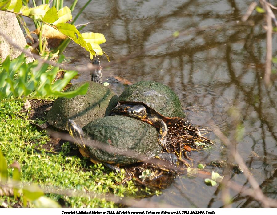 Picture #86: Turtles #2 900x698, 104,392 bytes (102K), (html file) Copyright, Michael Meissner 2011, All rights reserved Olympus E-3 camera with Olympus 50-200mm f/2.8-3.5 lens and Olympus EC-14 (1.4x) f/5.0, ISO 100, 1/320 sec, 283.0mm, auto mode, natural color, SHQ, matrix metering, IS1 (All Direction Shake IS) 35mm equivalent focal length 567.0mm, EC-14 Programs used: raw therapee Taken by Michael Meissner on February 25, 2011 14:20:09 Last modified on March 29, 2011 at 08:12 |