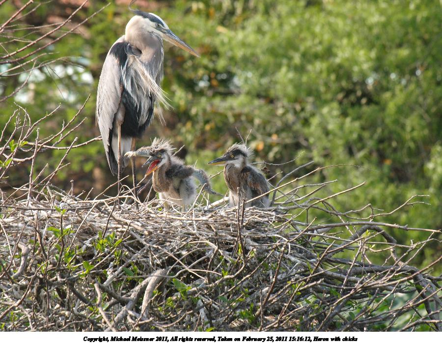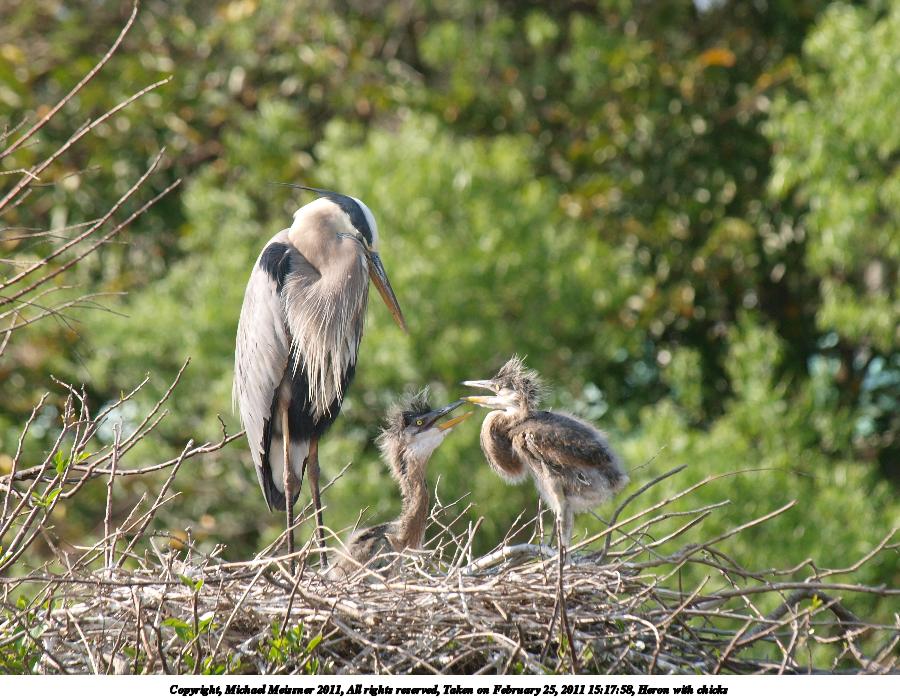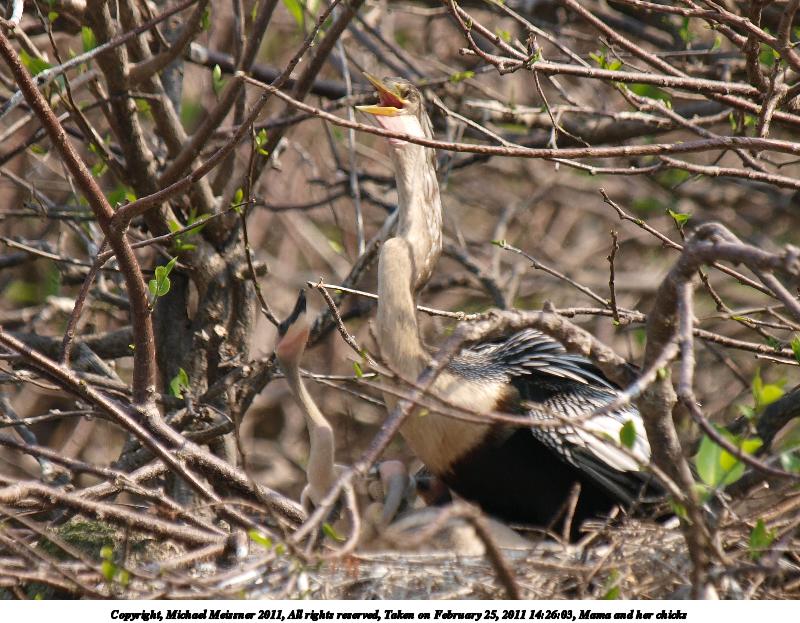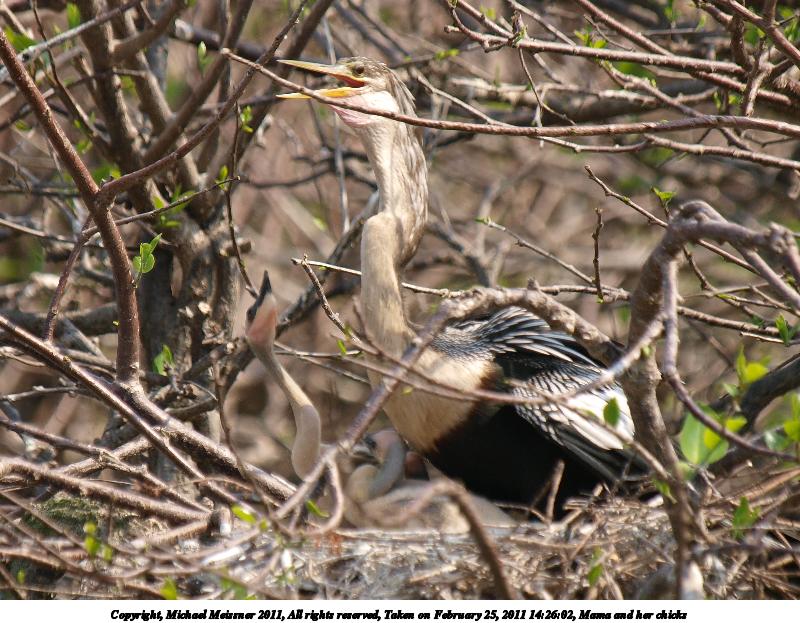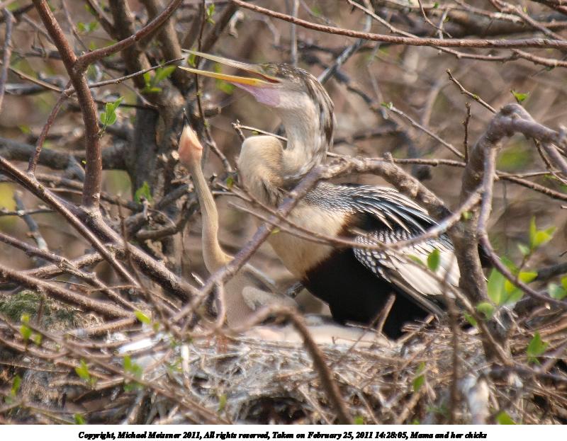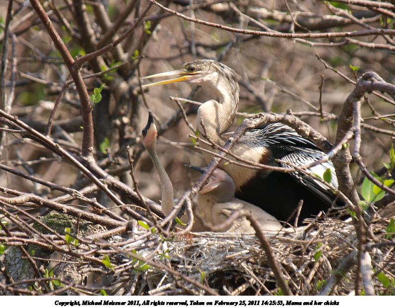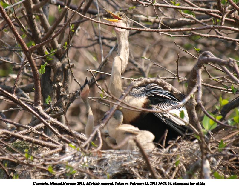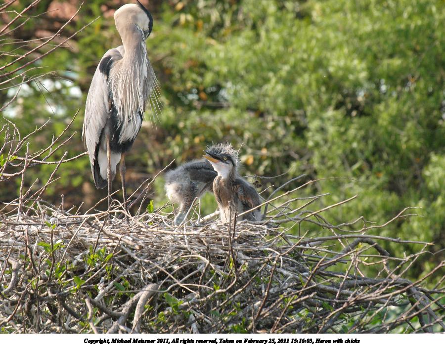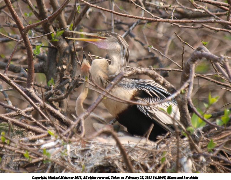 Picture #19: Heron with chicks #4 900x698, 172,220 bytes (169K), (html file) Copyright, Michael Meissner 2011, All rights reserved Olympus E-3 camera with Olympus 50-200mm f/2.8-3.5 lens and Olympus EC-14 (1.4x) f/11.0, ISO 800, 1/250 sec, 283.0mm, aperture priority, natural color, SHQ, matrix metering, auto + manual focus, IS1 (All Direction Shake IS) 35mm equivalent focal length 567.0mm, EC-14 Programs used: raw therapee Taken by Michael Meissner on February 25, 2011 15:16:05 Last modified on March 31, 2011 at 08:59 |
