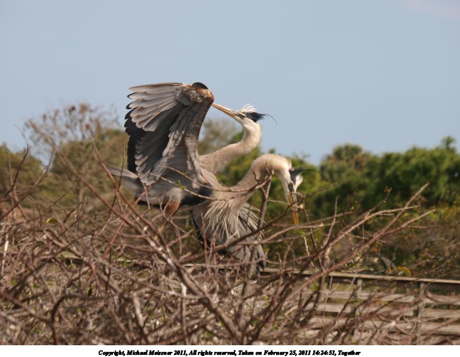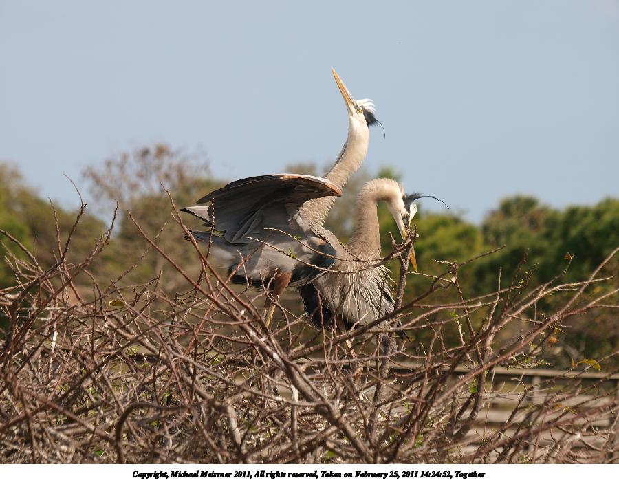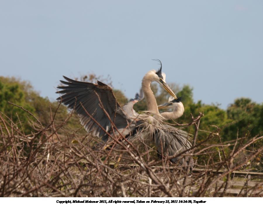 Picture #74: Together #2 900x698, 94,237 bytes (93K), (html file) Copyright, Michael Meissner 2011, All rights reserved Olympus E-3 camera with Olympus 50-200mm f/2.8-3.5 lens and Olympus EC-14 (1.4x) f/5.0, ISO 100, 1/500 sec, 136.0mm, auto mode, natural color, SHQ, matrix metering, auto + manual focus, IS1 (All Direction Shake IS) 35mm equivalent focal length 272.0mm, EC-14 Programs used: raw therapee Taken by Michael Meissner on February 25, 2011 14:24:51 Last modified on March 30, 2011 at 07:46 |
