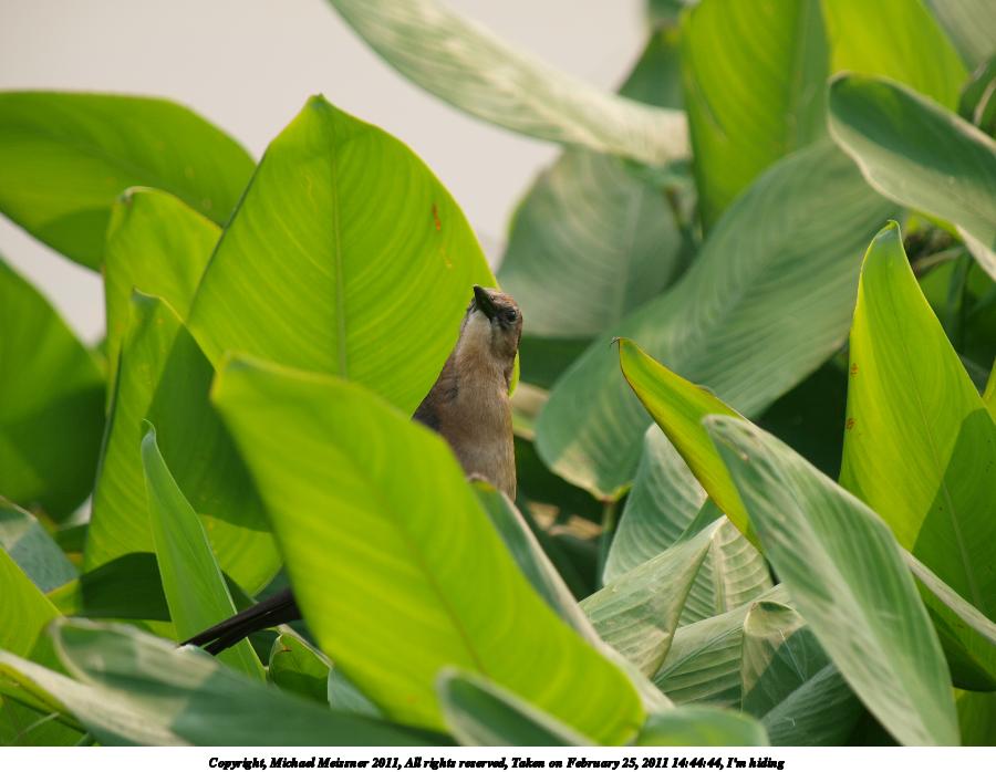 Picture #41: I'm hiding 900x698, 75,214 bytes (74K), (html file) Copyright, Michael Meissner 2011, All rights reserved Olympus E-3 camera with Olympus 50-200mm f/2.8-3.5 lens and Olympus EC-14 (1.4x) f/5.0, ISO 125, 1/250 sec, 283.0mm, auto mode, natural color, SHQ, matrix metering, manual focus, IS1 (All Direction Shake IS) 35mm equivalent focal length 567.0mm, EC-14 Programs used: raw therapee Taken by Michael Meissner on February 25, 2011 14:44:44 Last modified on March 30, 2011 at 23:47 |
