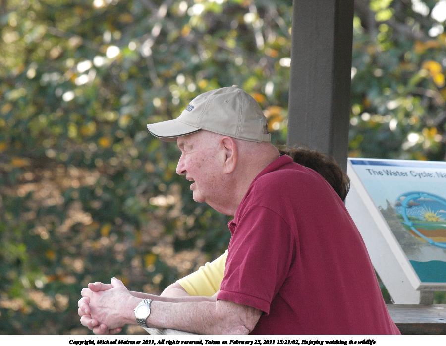 Picture #13: Enjoying watching the wildlife 900x698, 93,815 bytes (92K), (html file) Copyright, Michael Meissner 2011, All rights reserved Olympus E-3 camera with Olympus 50-200mm f/2.8-3.5 lens and Olympus EC-14 (1.4x) f/8.0, ISO 1250, 1/250 sec, 208.0mm, aperture priority, natural color, SHQ, matrix metering, auto + manual focus, IS1 (All Direction Shake IS) 35mm equivalent focal length 417.0mm, EC-14 Programs used: raw therapee Taken by Michael Meissner on February 25, 2011 15:21:02 Last modified on March 31, 2011 at 09:03 |