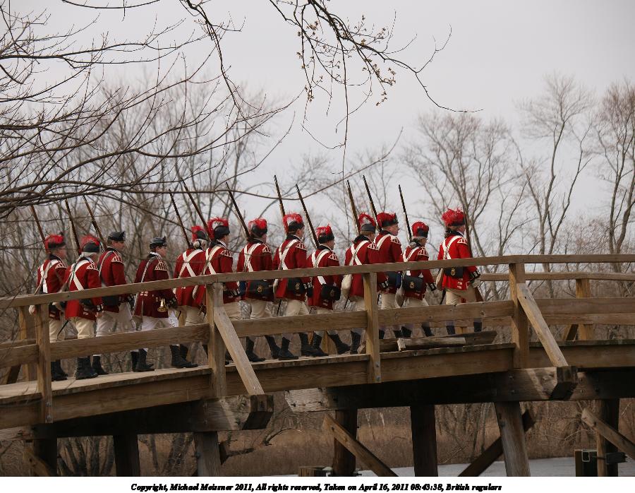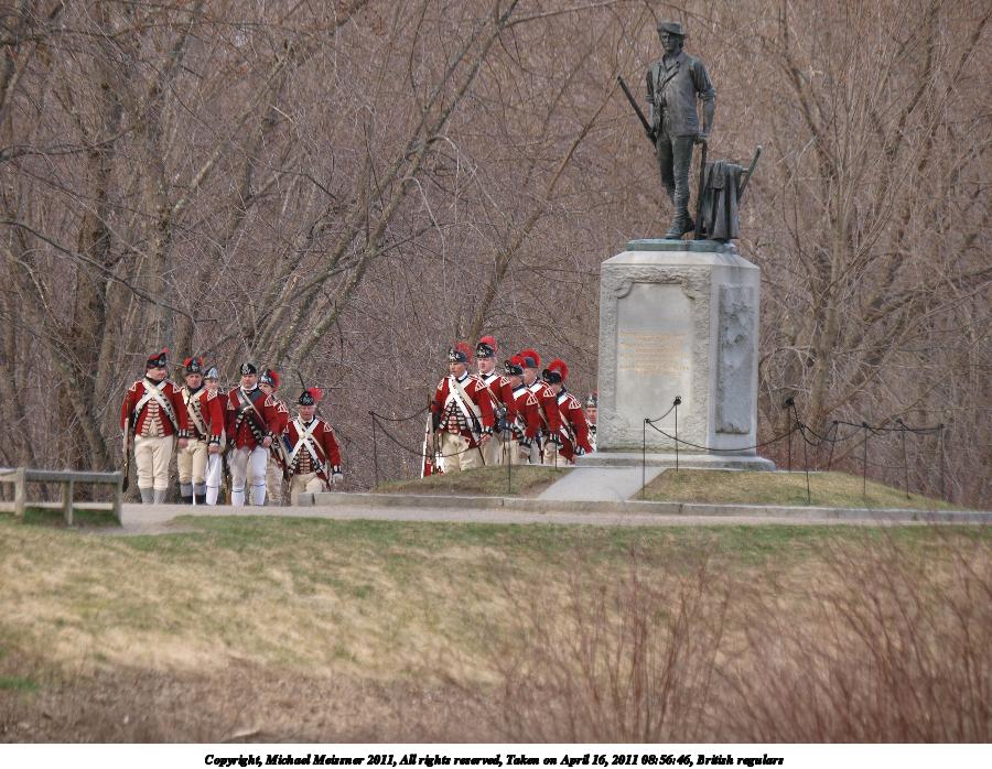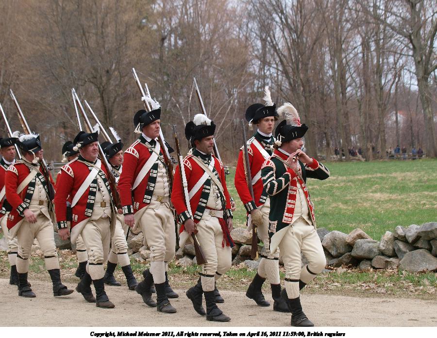 Picture #50: British regulars #2 Thumb: 450x338, 58,708 bytes (58K) Small: 900x698, 179,325 bytes (176K), (html file) Copyright, Michael Meissner 2011, All rights reserved Olympus E-3 camera with Olympus 50-200mm f/2.8-3.5 lens f/4.5, ISO 100, 1/320 sec, 59.0mm, auto mode, natural color, SHQ, matrix metering, IS1 (All Direction Shake IS) 35mm equivalent focal length 118.0mm Programs used: raw therapee Taken by Michael Meissner on April 16, 2011 11:58:39 Last modified on April 23, 2011 at 09:31 |