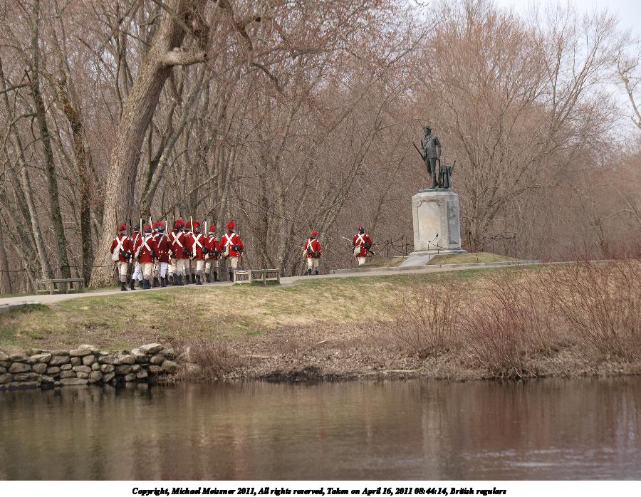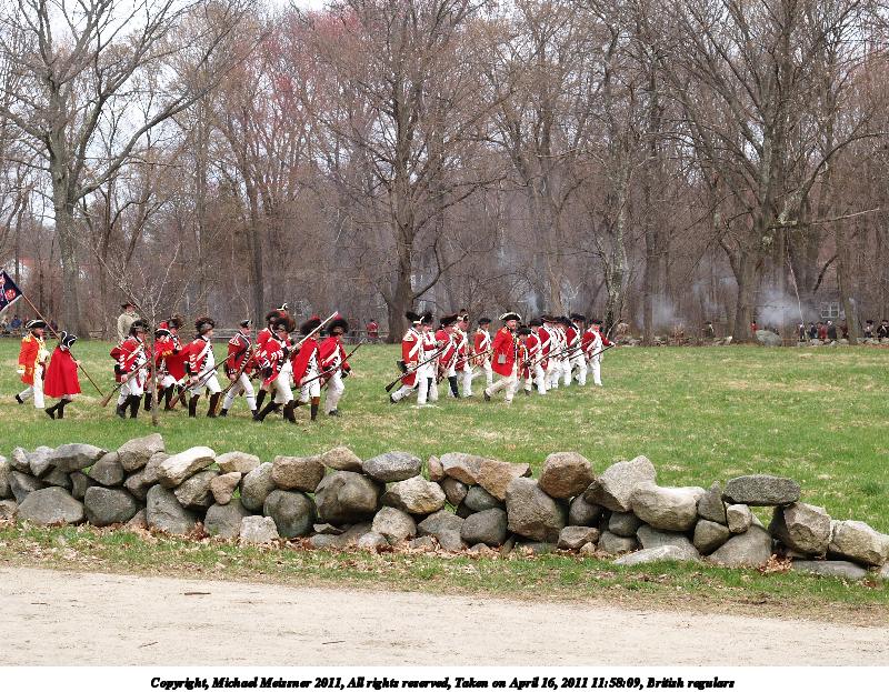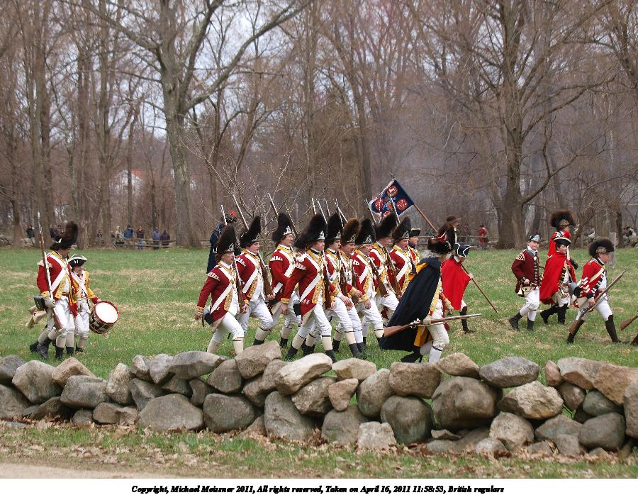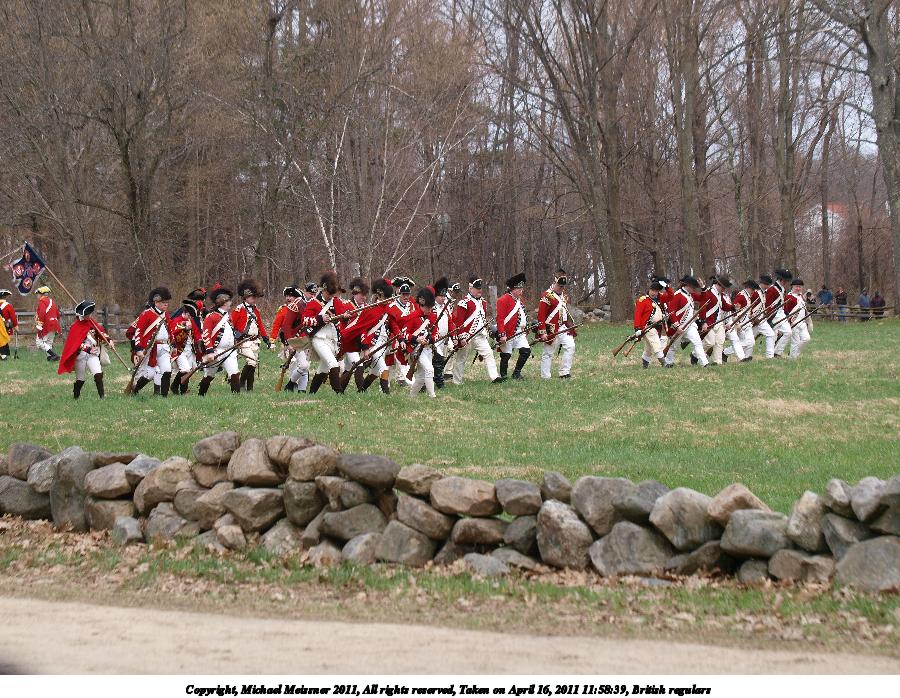 Picture #7: British regulars Thumb: 450x338, 55,683 bytes (55K) Small: 900x698, 148,160 bytes (145K), (html file) Copyright, Michael Meissner 2011, All rights reserved Olympus E-3 camera with Olympus 50-200mm f/2.8-3.5 lens f/4.0, ISO 100, 1/400 sec, 92.0mm, auto mode, natural color, SHQ, matrix metering, IS1 (All Direction Shake IS) 35mm equivalent focal length 184.0mm Programs used: raw therapee Taken by Michael Meissner on April 16, 2011 08:43:38 Last modified on April 20, 2011 at 19:33 |