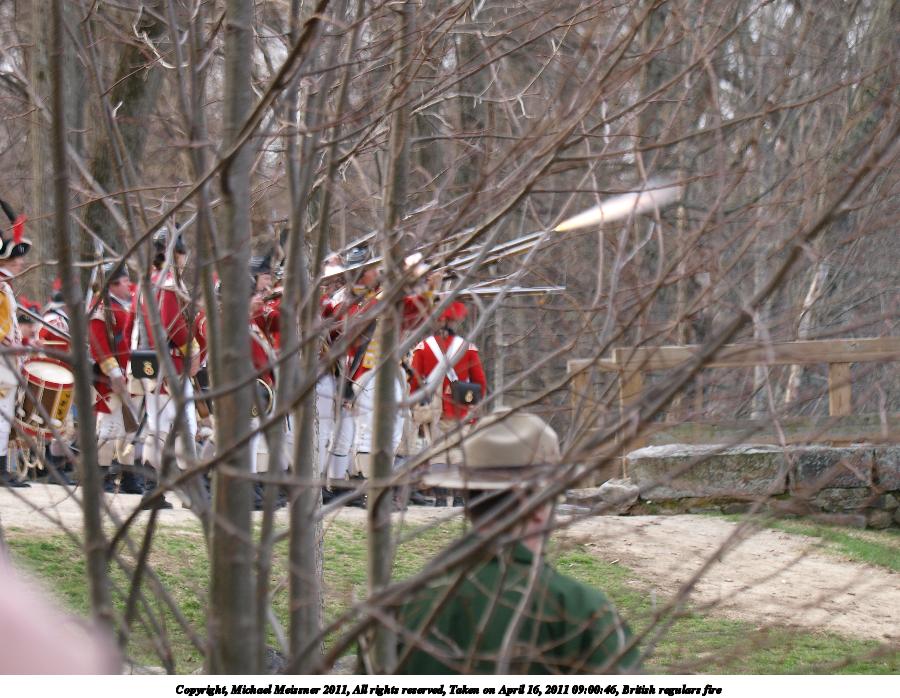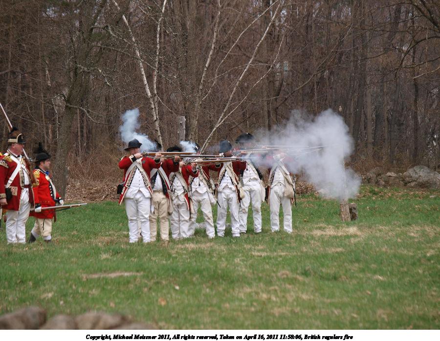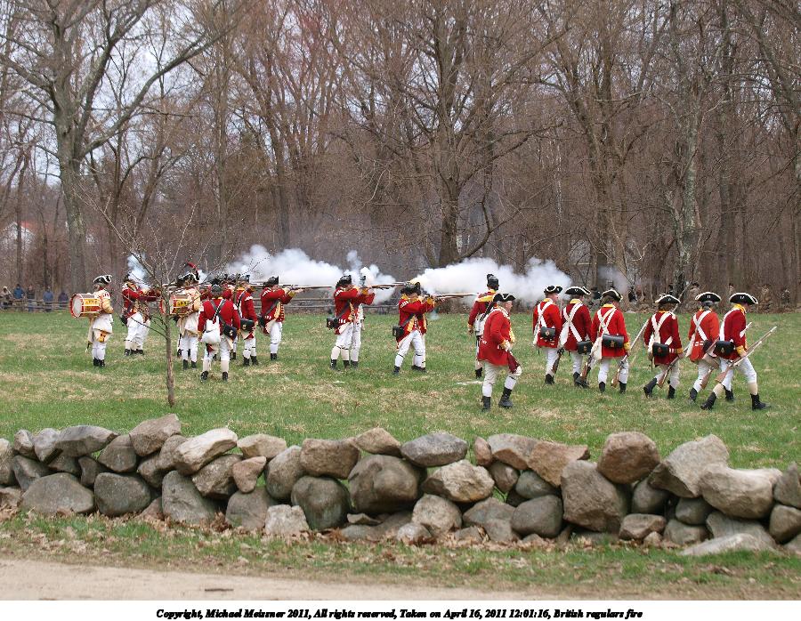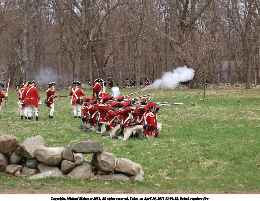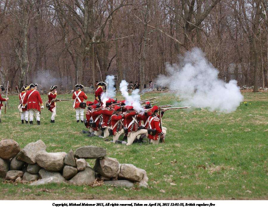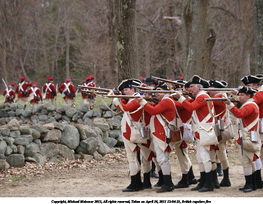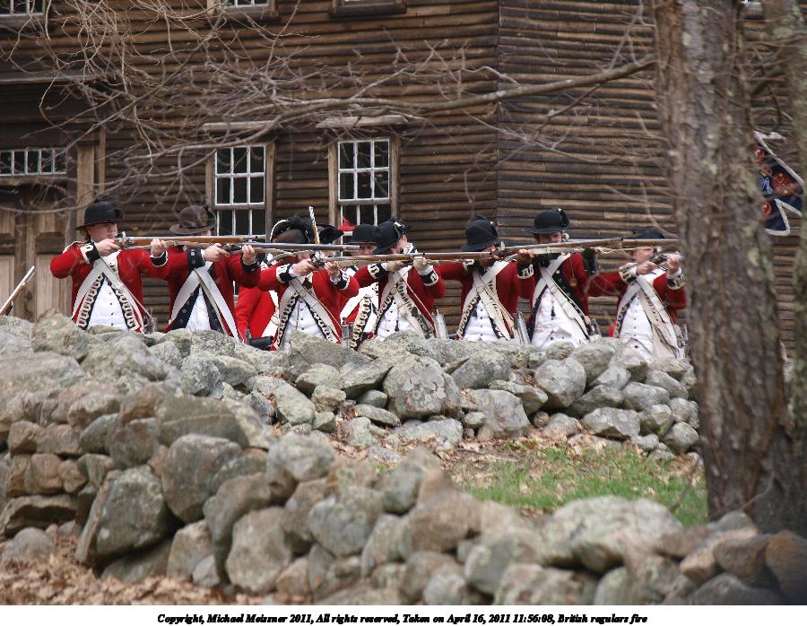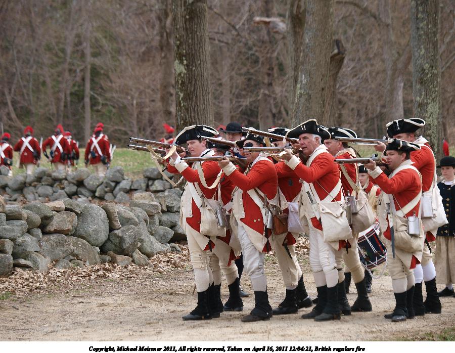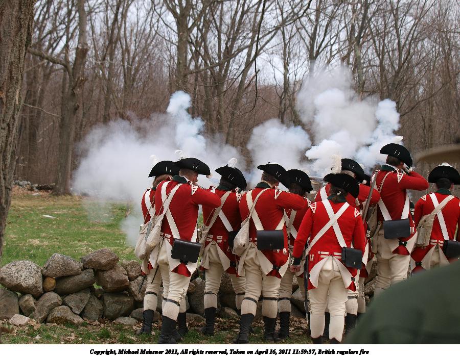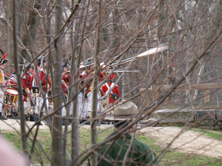 Picture #55: British regulars fire #6 Thumb: 450x338, 59,877 bytes (59K) Small: 900x698, 155,707 bytes (153K), (html file) Copyright, Michael Meissner 2011, All rights reserved Olympus E-3 camera with Olympus 50-200mm f/2.8-3.5 lens f/4.5, ISO 100, 1/320 sec, 50.0mm, auto mode, natural color, SHQ, matrix metering, IS1 (All Direction Shake IS) 35mm equivalent focal length 100.0mm Programs used: raw therapee Taken by Michael Meissner on April 16, 2011 11:59:37 Last modified on April 23, 2011 at 09:32 This picture is one of my favorites. |