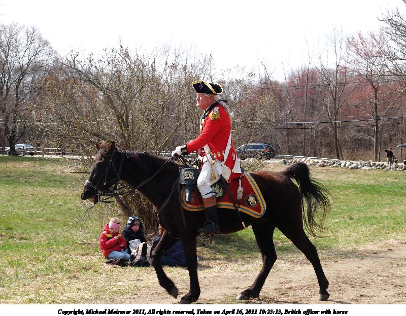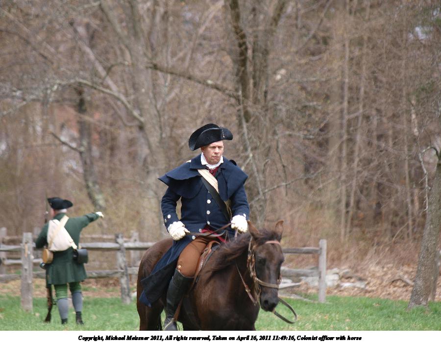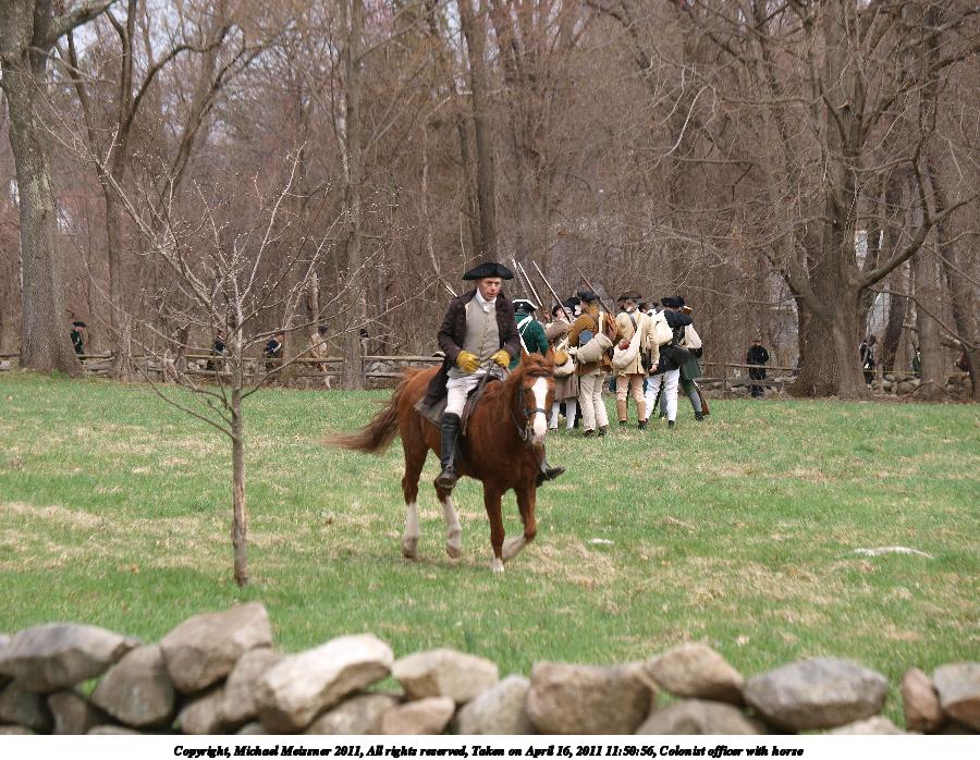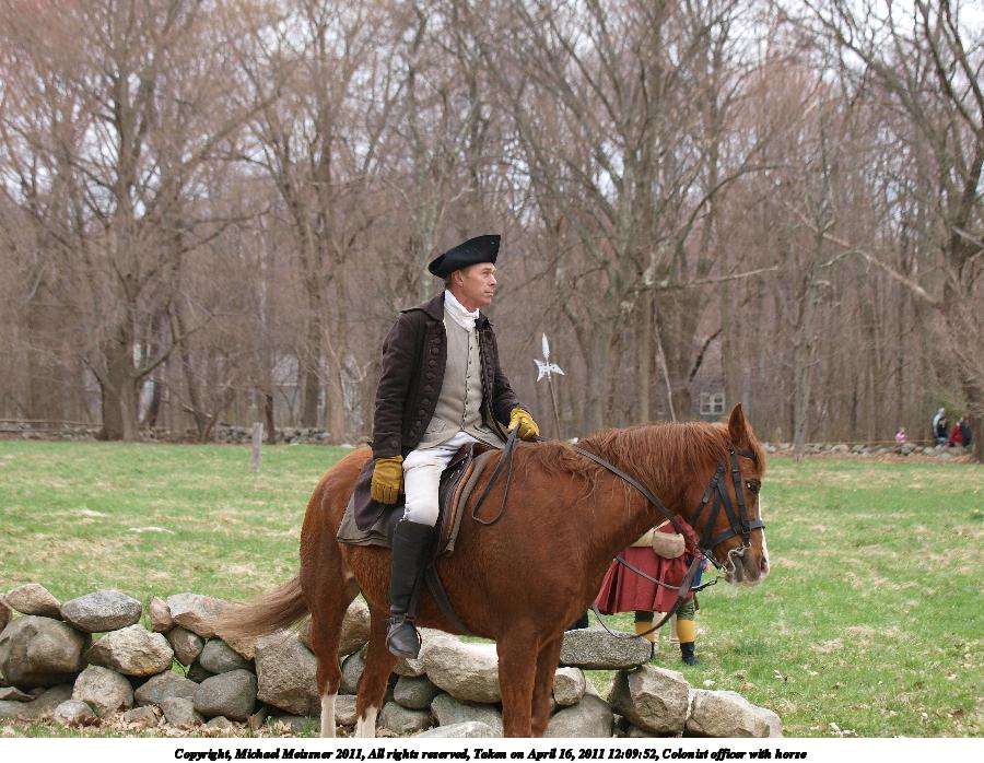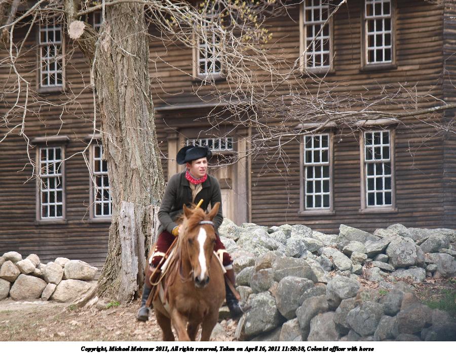 Picture #87: Colonist officer with horse #5 Thumb: 450x338, 55,412 bytes (55K) Small: 900x698, 143,660 bytes (141K), (html file) Copyright, Michael Meissner 2011, All rights reserved Olympus E-3 camera with Olympus 50-200mm f/2.8-3.5 lens f/4.0, ISO 100, 1/200 sec, 50.0mm, auto mode, natural color, SHQ, matrix metering, IS1 (All Direction Shake IS) 35mm equivalent focal length 100.0mm Programs used: raw therapee Taken by Michael Meissner on April 16, 2011 12:09:52 Last modified on April 23, 2011 at 09:39 |
