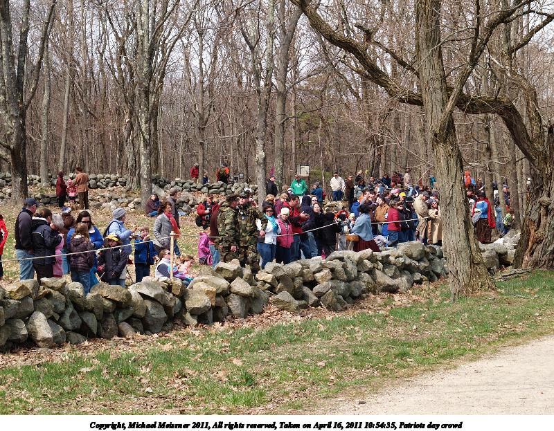 Picture #19: Patriots day crowd Thumb: 480x360, 79,629 bytes (78K) Small: 800x623, 205,777 bytes (201K), (html file) Copyright, Michael Meissner 2011, All rights reserved Olympus E-1 camera with Olympus 14-54mm f/2.8-3.5 lens f/5.6, ISO 100, 1/250 sec, 38.0mm, auto mode, SHQ, matrix metering, +2 contrast, +2 sharpening 35mm equivalent focal length 76.0mm Programs used: raw therapee Taken by Michael Meissner on April 16, 2011 10:54:35 Last modified on April 23, 2011 at 09:25 |