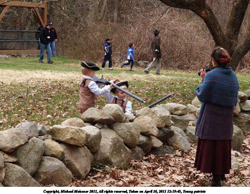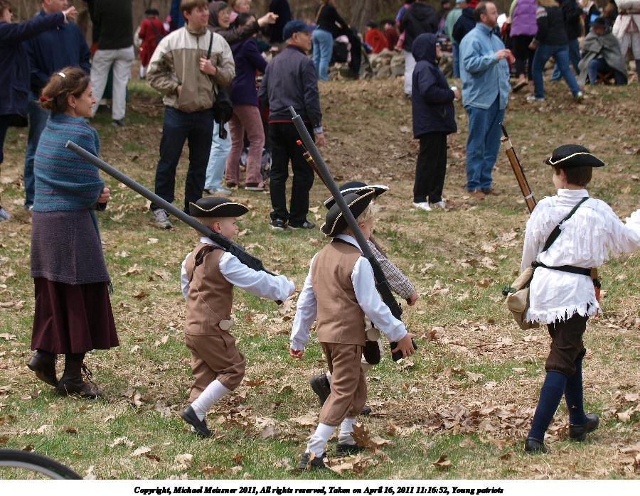 Picture #92: Young patriots #4 Thumb: 480x360, 67,907 bytes (67K) Small: 800x623, 165,016 bytes (162K), (html file) Copyright, Michael Meissner 2011, All rights reserved Olympus E-1 camera with Olympus 14-54mm f/2.8-3.5 lens f/4.5, ISO 100, 1/200 sec, 54.0mm, auto mode, SHQ, matrix metering, bias 0.3, +2 contrast, +2 sharpening 35mm equivalent focal length 108.0mm Programs used: raw therapee Taken by Michael Meissner on April 16, 2011 12:19:43 Last modified on April 23, 2011 at 09:41 |