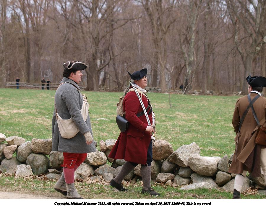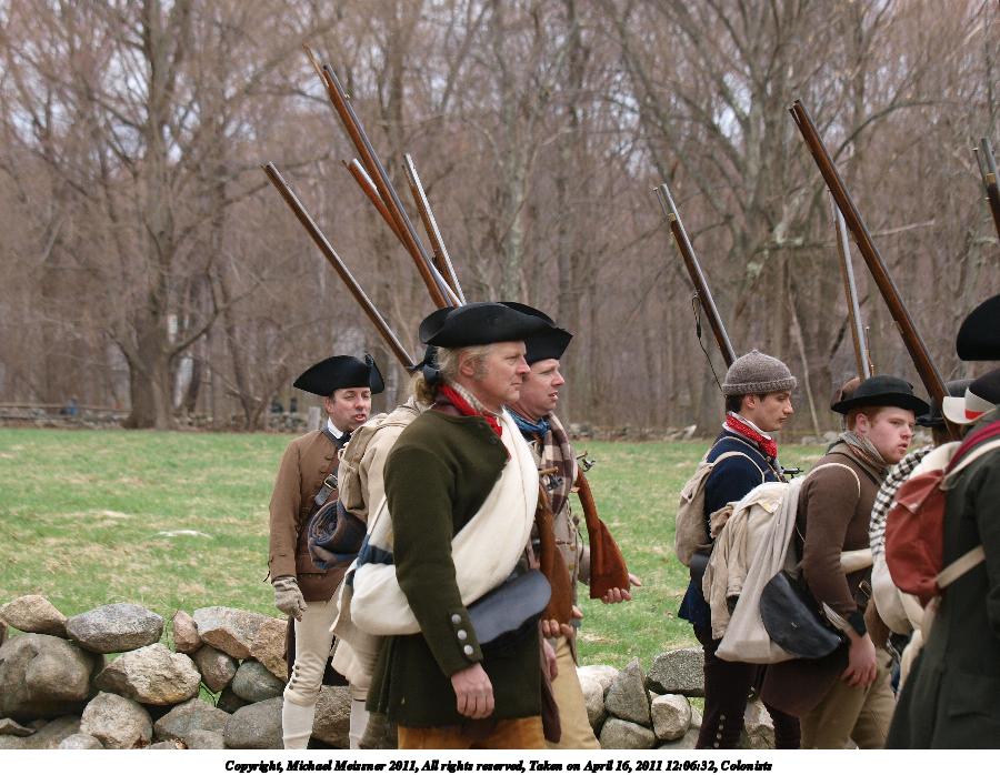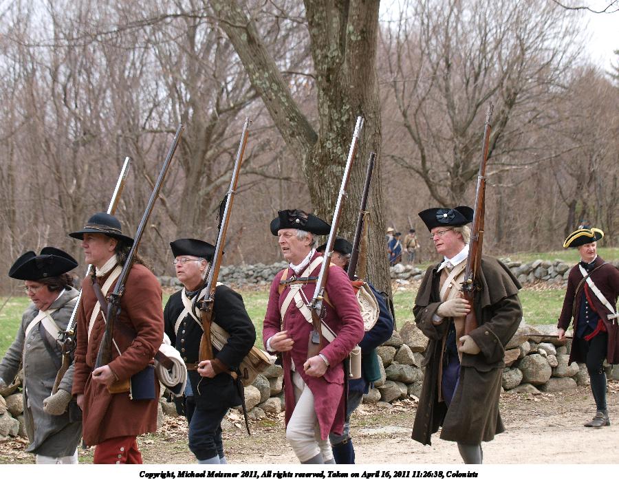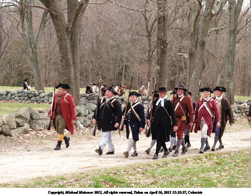Picture #22: Colonists Thumb: 450x338, 59,229 bytes (58K) Small: 900x698, 179,873 bytes (176K), (html file) Copyright, Michael Meissner 2011, All rights reserved Olympus E-3 camera with Olympus 50-200mm f/2.8-3.5 lens and Olympus EC-14 (1.4x) f/4.5, ISO 100, 1/200 sec, 70.0mm, auto mode, natural color, SHQ, matrix metering, IS1 (All Direction Shake IS) 35mm equivalent focal length 140.0mm, EC-14 Programs used: raw therapee Taken by Michael Meissner on April 16, 2011 09:00:36 Last modified on April 20, 2011 at 19:38 |