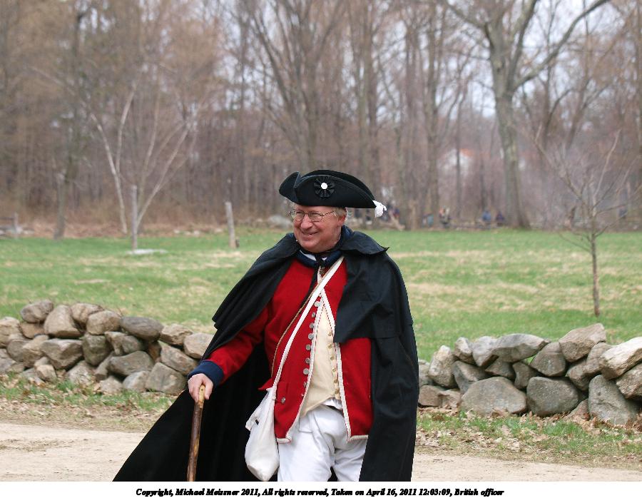 Picture #66: British officer Thumb: 450x338, 49,399 bytes (49K) Small: 900x698, 111,710 bytes (110K), (html file) Copyright, Michael Meissner 2011, All rights reserved Olympus E-3 camera with Olympus 50-200mm f/2.8-3.5 lens f/4.0, ISO 100, 1/250 sec, 56.0mm, auto mode, natural color, SHQ, matrix metering, IS1 (All Direction Shake IS) 35mm equivalent focal length 112.0mm Programs used: raw therapee Taken by Michael Meissner on April 16, 2011 12:03:09 Last modified on April 23, 2011 at 09:34 |