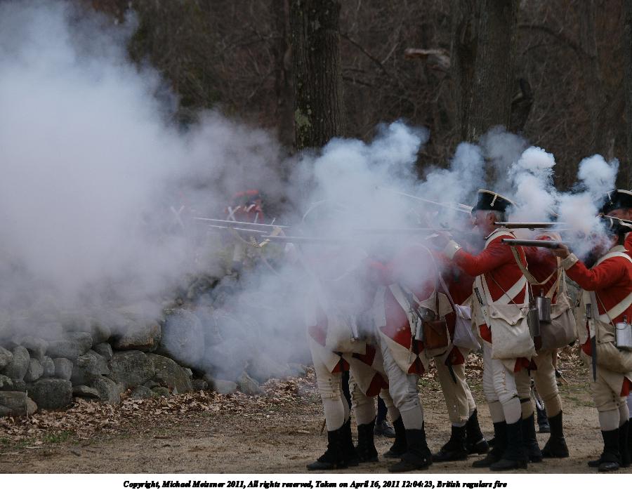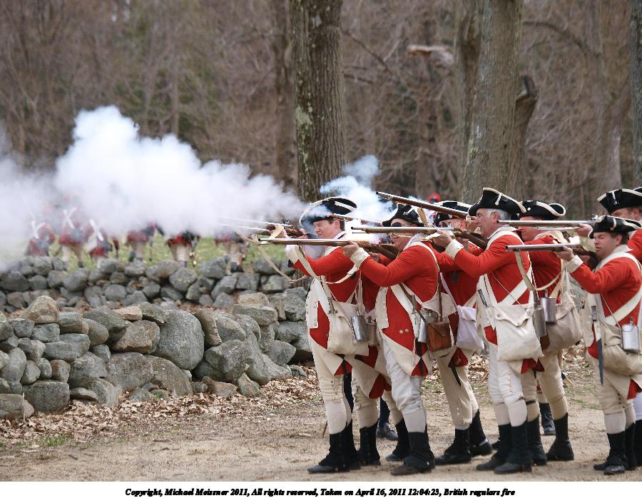 Picture #59: British regulars fire #10 Thumb: 450x338, 55,234 bytes (54K) Small: 900x698, 144,558 bytes (142K), (html file) Copyright, Michael Meissner 2011, All rights reserved Olympus E-3 camera with Olympus 50-200mm f/2.8-3.5 lens f/4.5, ISO 100, 1/400 sec, 69.0mm, auto mode, natural color, SHQ, matrix metering, IS1 (All Direction Shake IS) 35mm equivalent focal length 138.0mm Programs used: raw therapee Taken by Michael Meissner on April 16, 2011 12:01:37 Last modified on April 23, 2011 at 09:33 This picture is one of my favorites. |