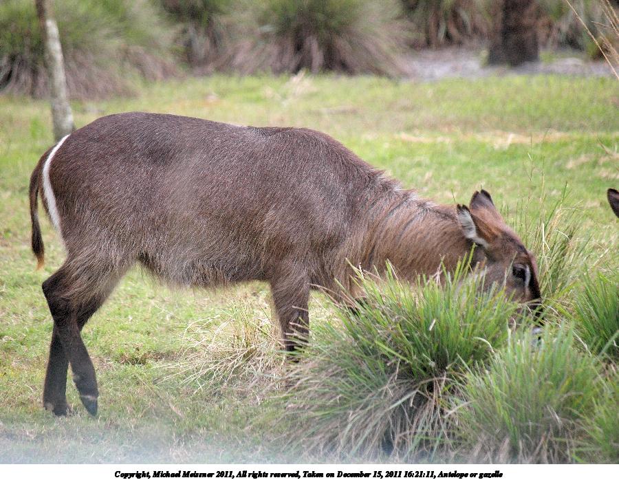 Picture #7: Antelope or gazelle #3 1000x773, 226,665 bytes (222K), (html file) Copyright, Michael Meissner 2011, All rights reserved Olympus E-5 camera with Olympus 14-54mm f/2.8-3.5 lens f/3.3, ISO 400, 1/100 sec, 41.0mm, auto mode, vivid color, matrix metering, IS1 (All Direction Shake IS) 35mm equivalent focal length 82.0mm Programs used: adjusttime, crop, raw therapee Taken by Michael Meissner on December 15, 2011 17:00:59 Last modified on February 19, 2012 at 15:42 |