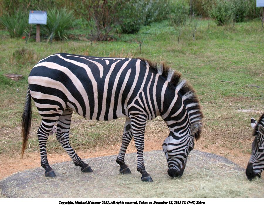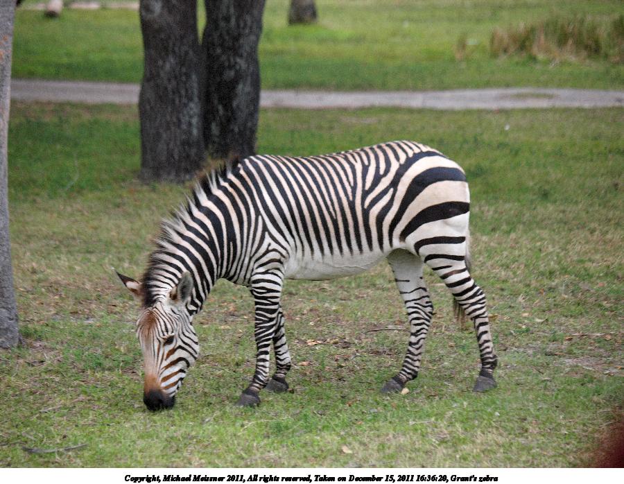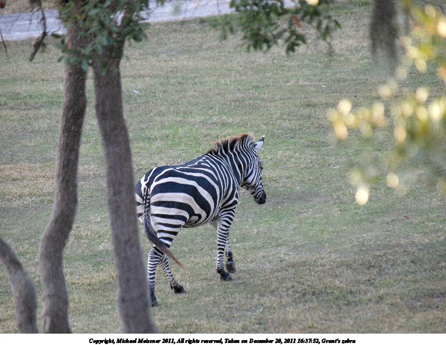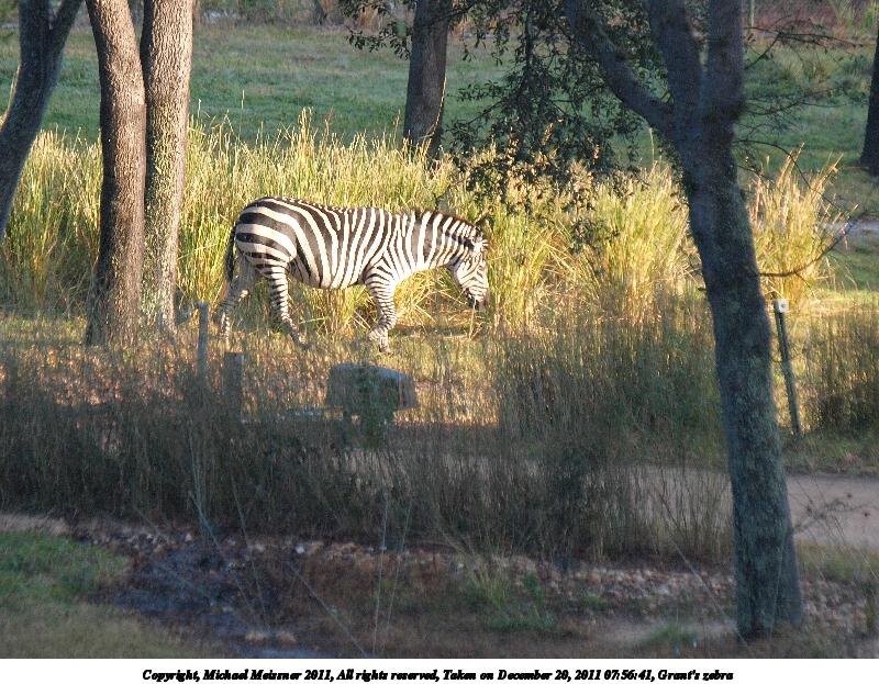 Picture #77: Grant's zebra #3 900x698, 156,371 bytes (153K), (html file) Copyright, Michael Meissner 2011, All rights reserved Olympus E-3 camera with Olympus 50-200mm f/2.8-3.5 lens and Olympus EC-14 (1.4x) f/4.5, ISO 1250, 1/250 sec, 208.0mm, auto mode, vivid color, matrix metering, manual focus, IS1 (All Direction Shake IS), noise filter low 35mm equivalent focal length 417.0mm, EC-14 Programs used: adjusttime, raw therapee Taken by Michael Meissner on December 20, 2011 17:00:20 Last modified on February 14, 2012 at 08:49 |