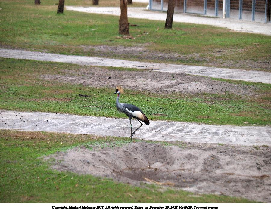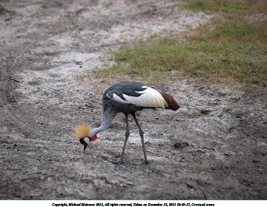 Picture #29: Crowned crane #2 900x698, 152,442 bytes (149K), (html file) Copyright, Michael Meissner 2011, All rights reserved Olympus E-3 camera with Olympus 50-200mm f/2.8-3.5 lens f/2.9, ISO 640, 1/250 sec, 108.0mm, auto mode, vivid color, matrix metering, IS1 (All Direction Shake IS), noise filter low 35mm equivalent focal length 216.0mm Programs used: adjusttime, crop, raw therapee Taken by Michael Meissner on December 15, 2011 16:43:54 Last modified on February 19, 2012 at 15:30 |