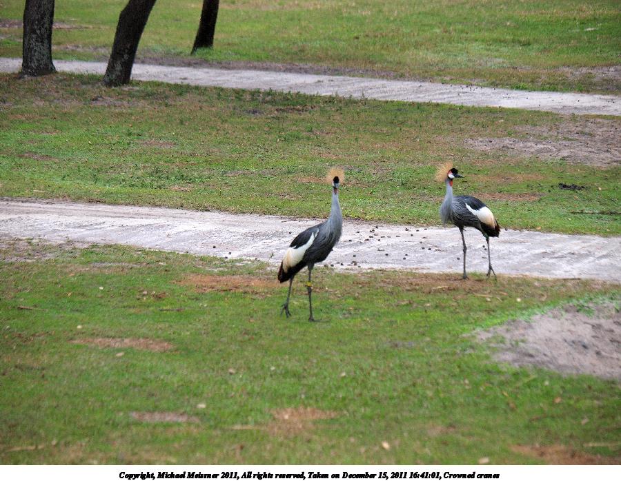 Picture #61: Crowned cranes 800x623, 128,791 bytes (126K), (html file) Copyright, Michael Meissner 2011, All rights reserved Olympus E-3 camera with Olympus 50-200mm f/2.8-3.5 lens f/3.5, ISO 1000, 1/250 sec, 200.0mm, auto mode, vivid color, matrix metering, IS1 (All Direction Shake IS), noise filter low 35mm equivalent focal length 401.0mm Programs used: adjusttime, crop, gimp, raw therapee Taken by Michael Meissner on December 15, 2011 16:22:58 Last modified on February 19, 2012 at 14:23 |