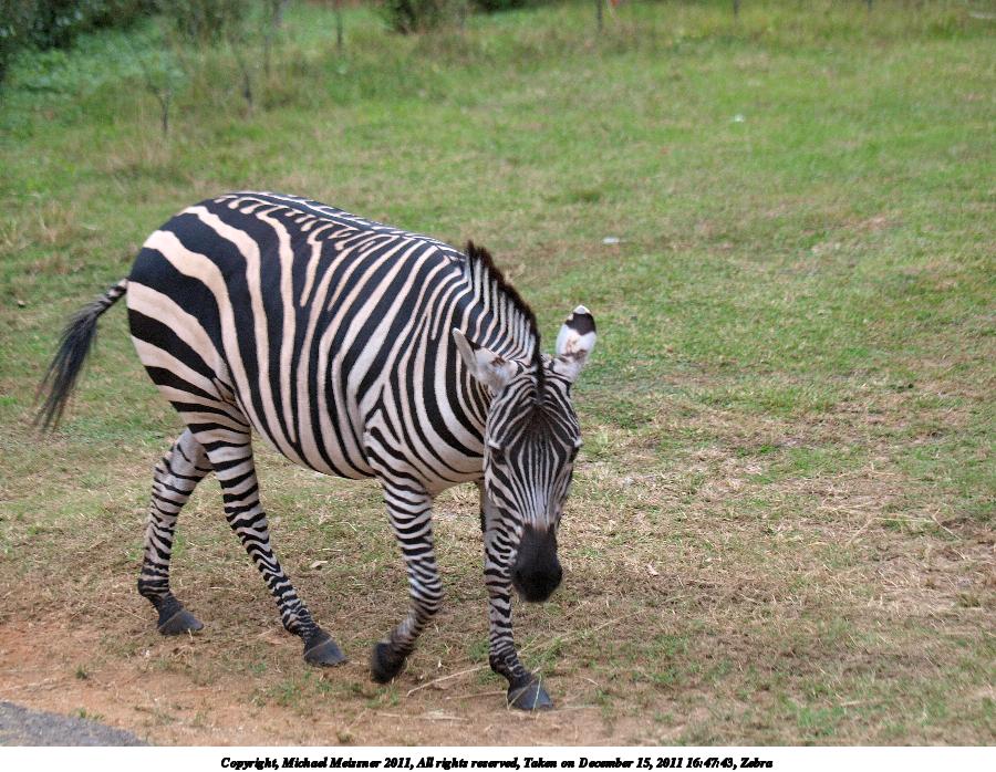 Picture #25: Zebra #2 900x698, 171,901 bytes (168K), (html file) Copyright, Michael Meissner 2011, All rights reserved Olympus E-3 camera with Olympus 50-200mm f/2.8-3.5 lens f/2.8, ISO 250, 1/125 sec, 60.0mm, auto mode, vivid color, matrix metering, IS1 (All Direction Shake IS), noise filter low 35mm equivalent focal length 120.0mm Programs used: adjusttime, crop, raw therapee Taken by Michael Meissner on December 15, 2011 16:47:44 Last modified on February 19, 2012 at 15:32 |