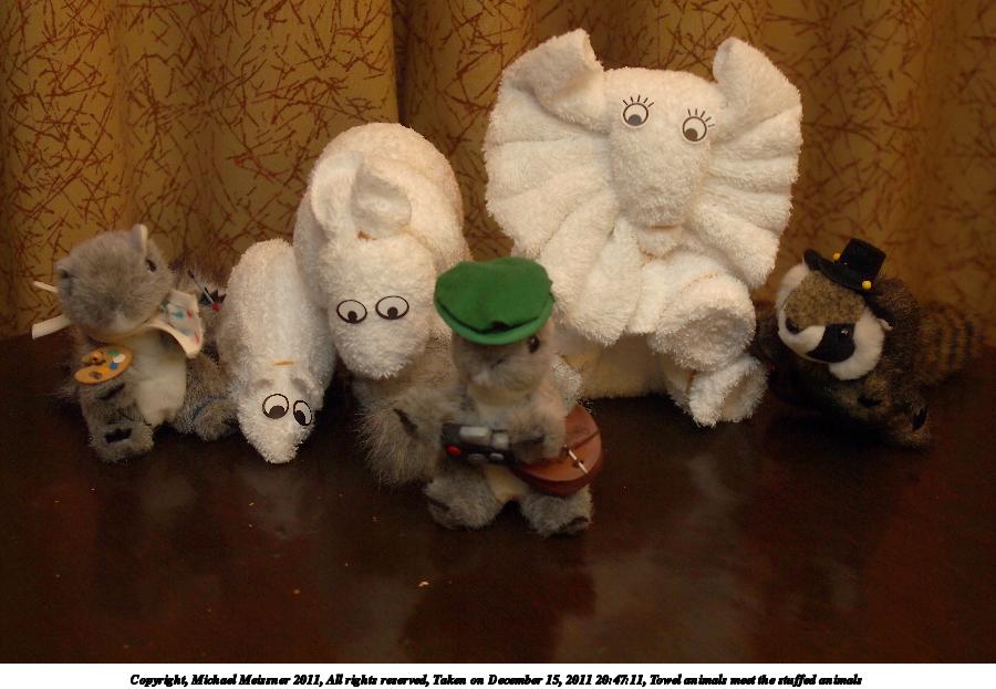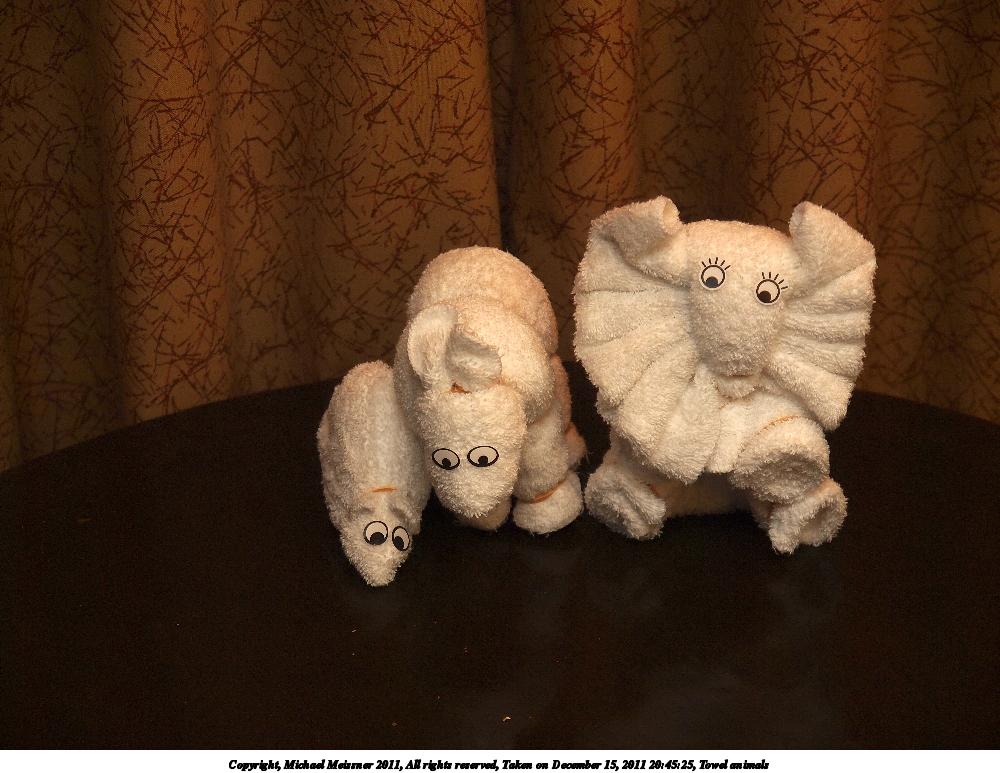 Picture #111: Towel animals meet the stuffed animals #2 1000x773, 130,095 bytes (128K), (html file) Copyright, Michael Meissner 2011, All rights reserved Olympus E-5 camera with Olympus 14-54mm f/2.8-3.5 lens f/3.1, ISO 200, Metz 48 flash, 1/60 sec, 25.0mm, auto mode, vivid color, matrix metering, IS1 (All Direction Shake IS) 35mm equivalent focal length 50.0mm Programs used: adjusttime, raw therapee Taken by Michael Meissner on December 18, 2011 09:16:29 Last modified on February 09, 2012 at 00:14 This picture is one of my favorites. |