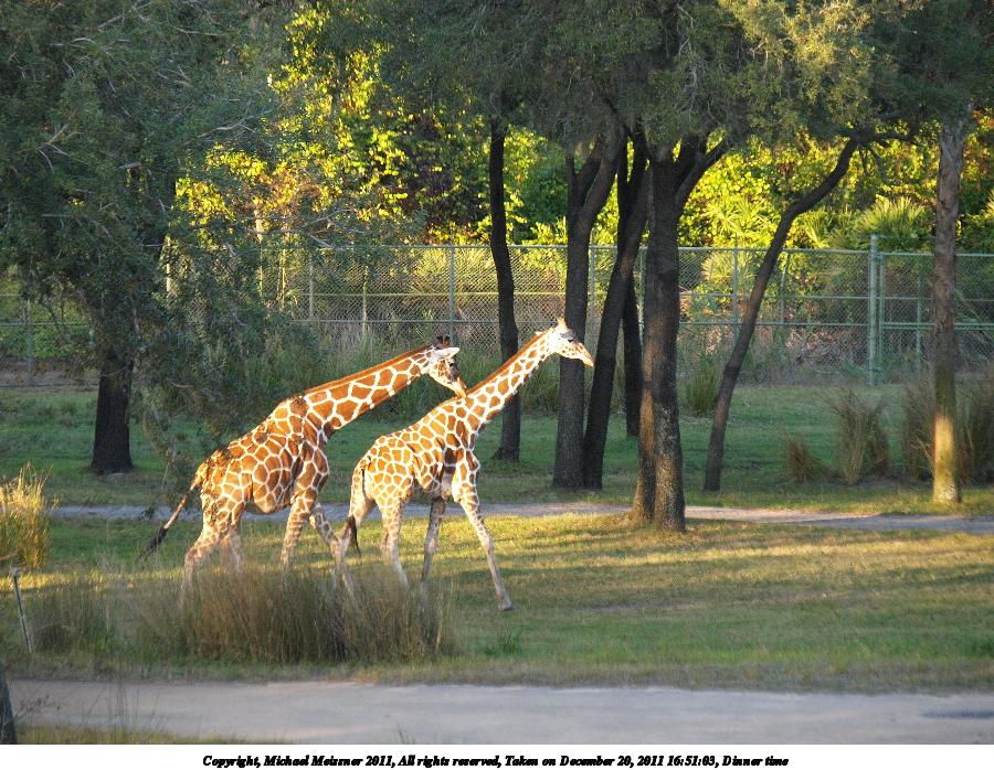 Picture #99: Reticulated Giraffes #2 900x698, 128,177 bytes (126K), (html file) Copyright, Michael Meissner 2011, All rights reserved Olympus E-3 camera with Olympus 50-200mm f/2.8-3.5 lens and Olympus EC-14 (1.4x) f/4.9, ISO 500, 1/250 sec, 283.0mm, auto mode, vivid color, matrix metering, auto + manual focus, IS1 (All Direction Shake IS), noise filter low 35mm equivalent focal length 567.0mm, EC-14 Programs used: adjusttime, raw therapee Taken by Michael Meissner on December 20, 2011 16:36:59 Last modified on February 14, 2012 at 08:37 |