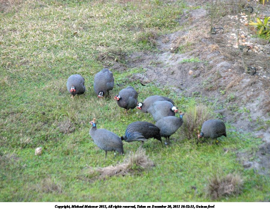 Picture #83: Guinea fowl #3 900x698, 180,647 bytes (177K), (html file) Copyright, Michael Meissner 2011, All rights reserved Olympus E-3 camera with Olympus 50-200mm f/2.8-3.5 lens and Olympus EC-14 (1.4x) f/4.7, ISO 1250, 1/250 sec, 239.0mm, auto mode, vivid color, matrix metering, auto + manual focus, IS1 (All Direction Shake IS), noise filter low 35mm equivalent focal length 479.0mm, EC-14 Programs used: adjusttime, raw therapee Taken by Michael Meissner on December 20, 2011 16:52:33 Last modified on February 14, 2012 at 08:46 |