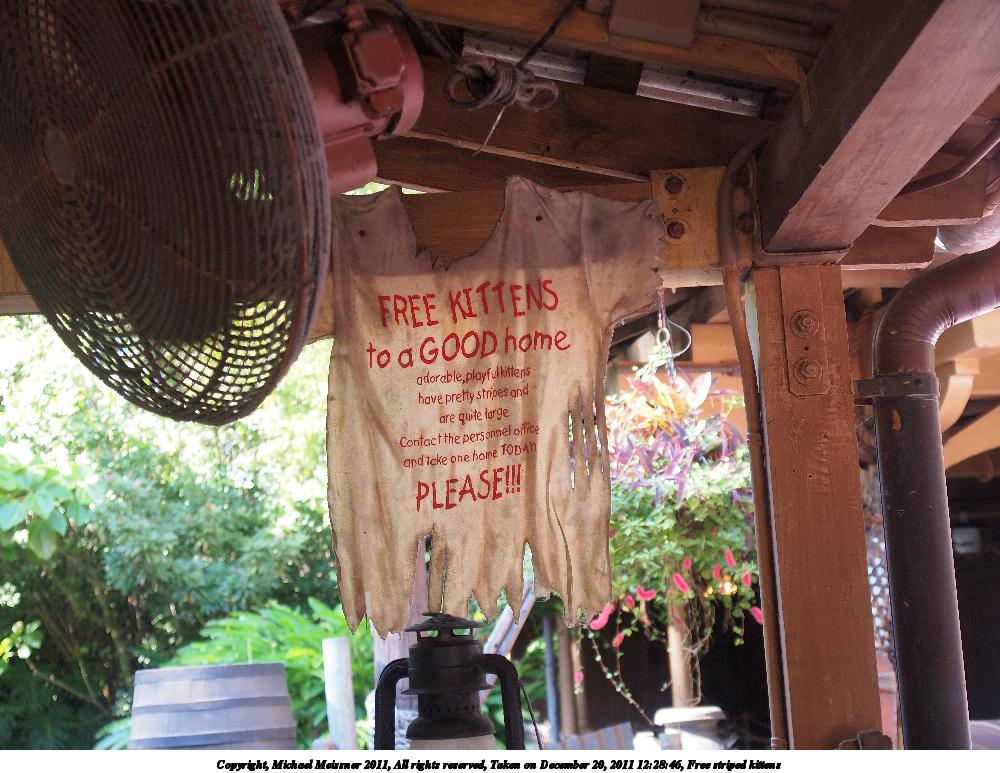 Picture #22: Free striped kittens 1000x773, 155,496 bytes (152K), (html file) Copyright, Michael Meissner 2011, All rights reserved Olympus E-5 camera with Olympus 14-54mm f/2.8-3.5 lens f/3.2, ISO 320, 1/60 sec, 29.0mm, auto mode, vivid color, matrix metering, IS1 (All Direction Shake IS) 35mm equivalent focal length 58.0mm Programs used: adjusttime, raw therapee Taken by Michael Meissner on December 20, 2011 12:28:46 Last modified on February 16, 2012 at 22:02 |
