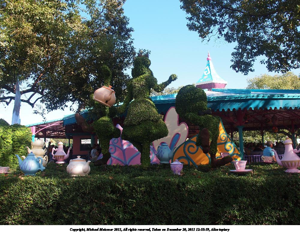 Picture #8: Alice topiary 1000x773, 277,699 bytes (272K), (html file) Copyright, Michael Meissner 2011, All rights reserved Olympus E-5 camera with Olympus 14-54mm f/2.8-3.5 lens f/5.0, ISO 200, 1/250 sec, 14.0mm, auto mode, vivid color, matrix metering, IS1 (All Direction Shake IS) 35mm equivalent focal length 28.0mm Programs used: adjusttime, raw therapee Taken by Michael Meissner on December 20, 2011 12:55:59 Last modified on February 16, 2012 at 22:08 |