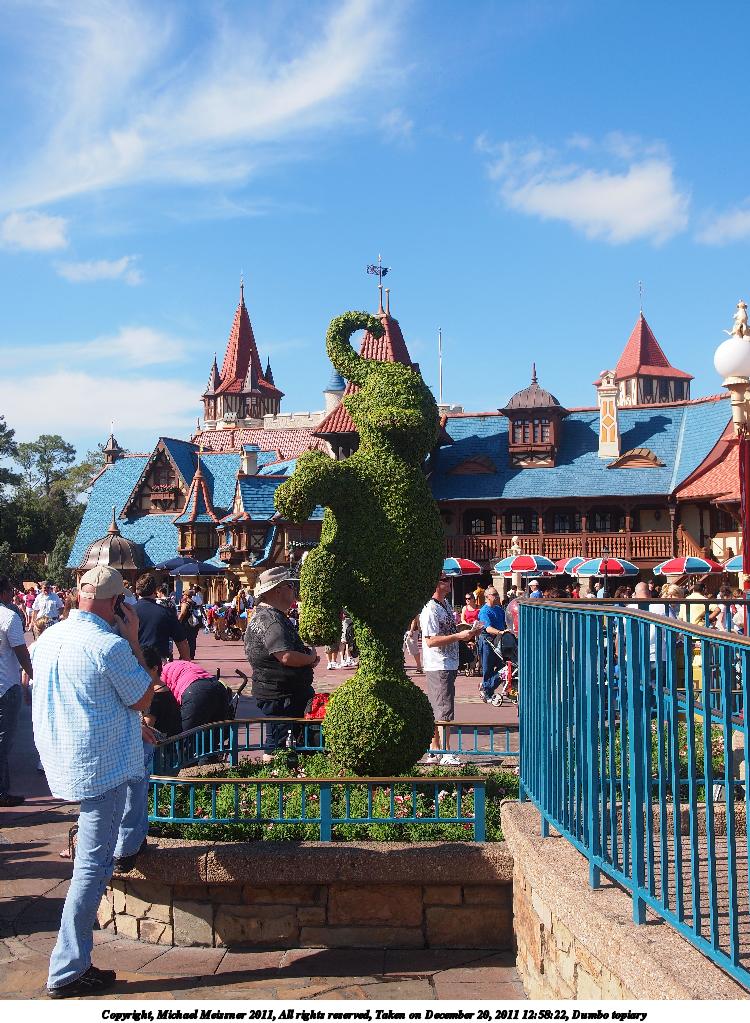 Picture #7: Dumbo topiary 750x1023, 195,508 bytes (191K), (html file) Copyright, Michael Meissner 2011, All rights reserved Olympus E-5 camera with Olympus 14-54mm f/2.8-3.5 lens f/7.1, ISO 200, 1/400 sec, 22.0mm, auto mode, vivid color, matrix metering, IS1 (All Direction Shake IS) 35mm equivalent focal length 44.0mm Programs used: adjusttime, raw therapee Taken by Michael Meissner on December 20, 2011 12:58:22 Last modified on February 16, 2012 at 22:08 |