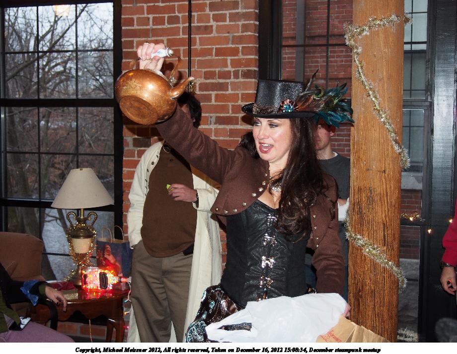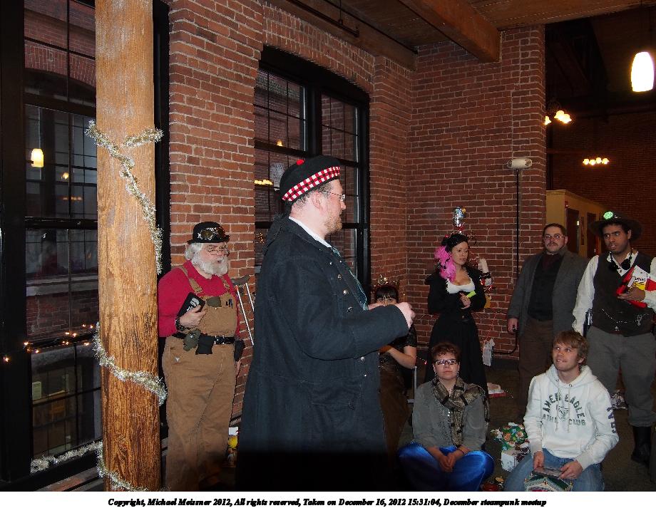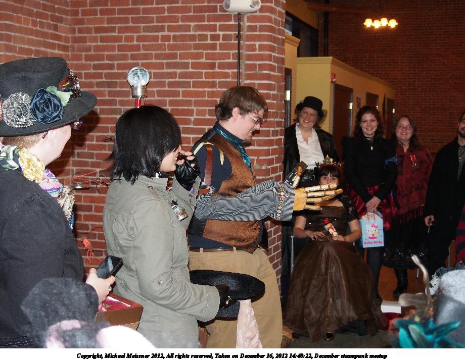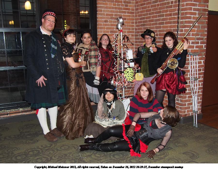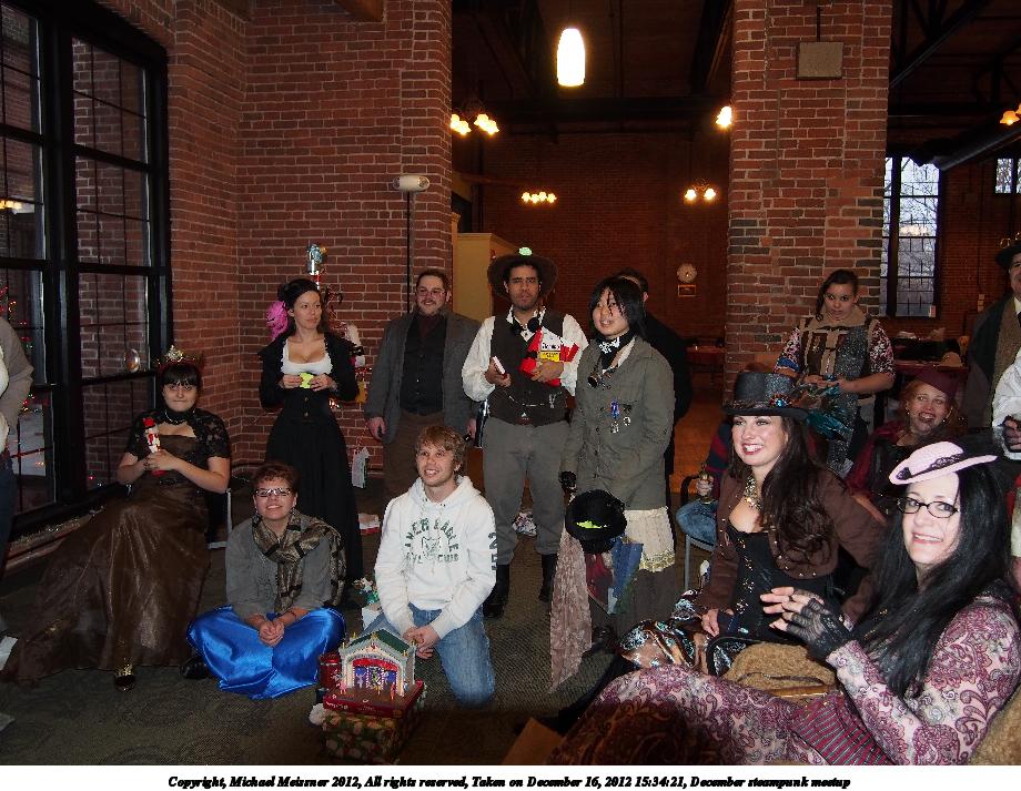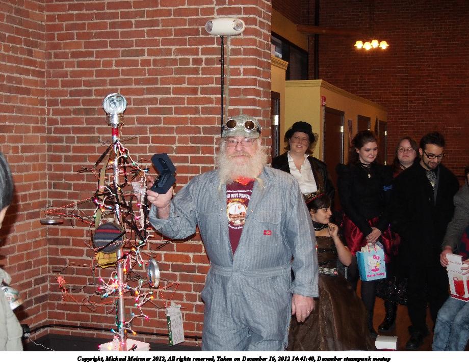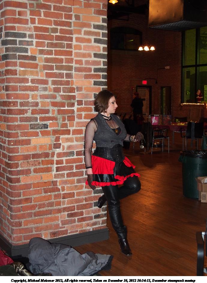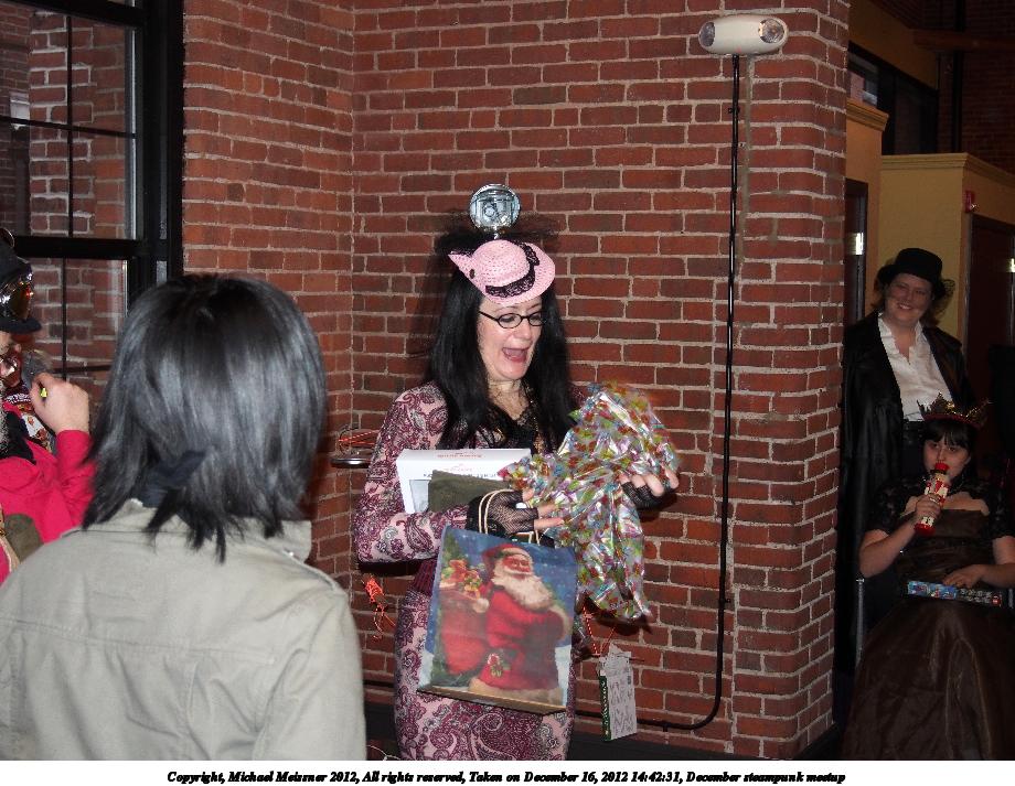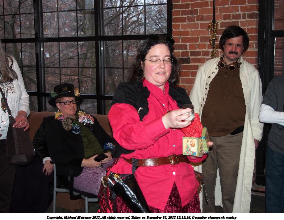 Picture #10: December steampunk meetup #10 Small: 920x713, 147,103 bytes (144K), (html file) Large: 4600x3450, 4,706,685 bytes (4.5M), (html file) Copyright, Michael Meissner 2012, All rights reserved Olympus E-PM2 camera with Olympus-m43 14-42mm-IIR f/3.5-5.6 lens f/3.5, ISO 800, flash (+0.33 flash compensation), 1/60 sec, 14.0mm, auto mode, natural color, matrix metering, IS1 (All Direction Shake IS), noise reduction auto 35mm equivalent focal length 28.0mm Programs used: crop, raw therapee Taken by Michael Meissner on December 16, 2012 15:31:04 Last modified on July 15, 2013 at 10:38 |