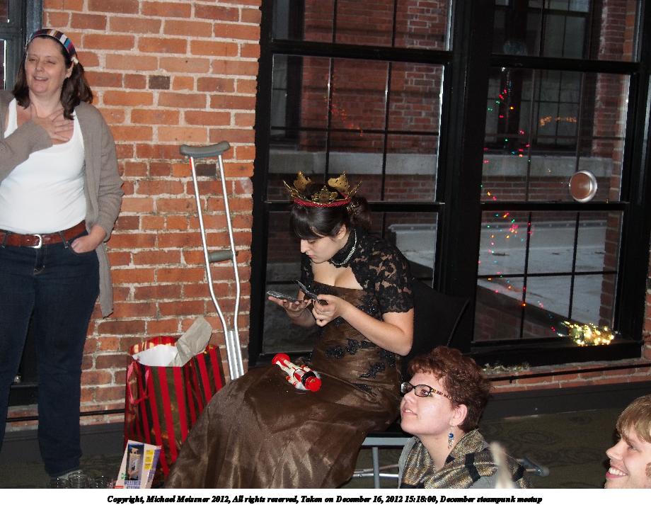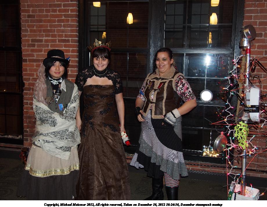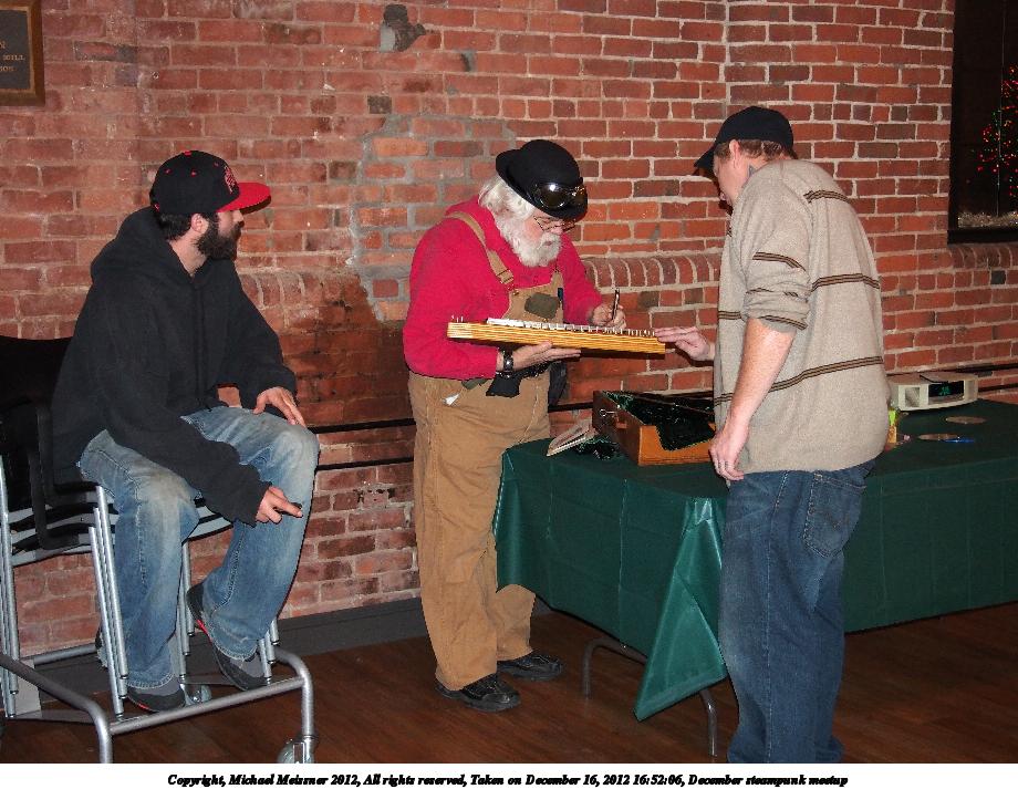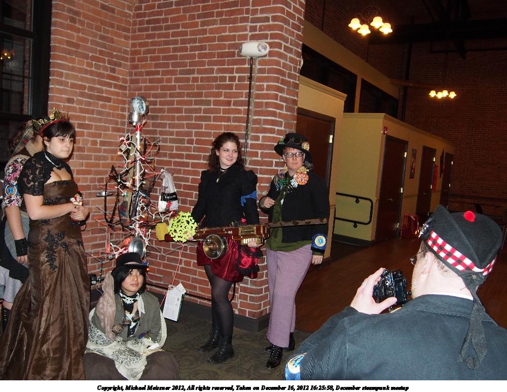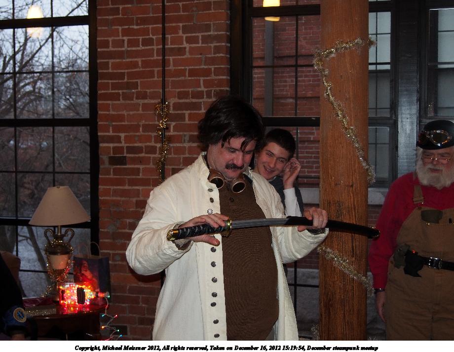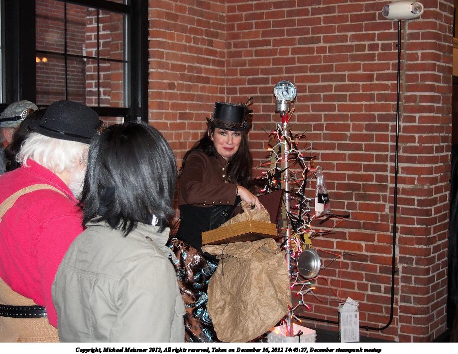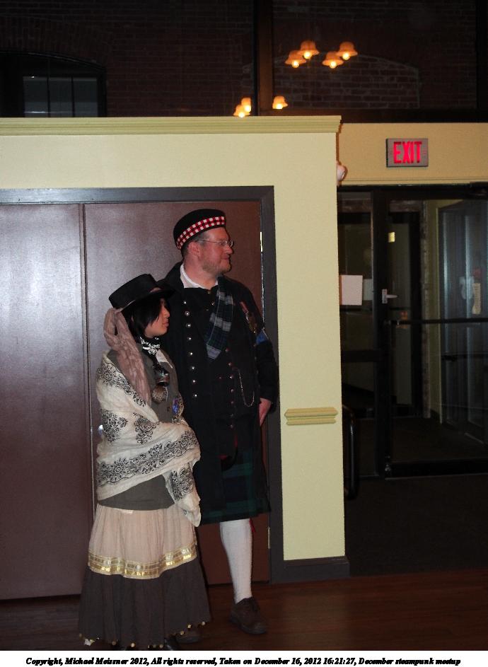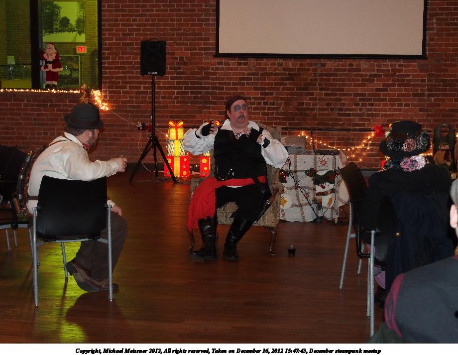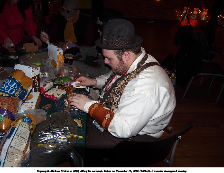 Picture #10: December steampunk meetup #10 Small: 920x713, 147,103 bytes (144K), (html file) Large: 4600x3450, 4,706,685 bytes (4.5M), (html file) Copyright, Michael Meissner 2012, All rights reserved Olympus E-PM2 camera with Olympus-m43 14-42mm-IIR f/3.5-5.6 lens f/3.5, ISO 800, flash (+0.33 flash compensation), 1/60 sec, 14.0mm, auto mode, natural color, matrix metering, IS1 (All Direction Shake IS), noise reduction auto 35mm equivalent focal length 28.0mm Programs used: crop, raw therapee Taken by Michael Meissner on December 16, 2012 15:31:04 Last modified on July 15, 2013 at 10:38 |