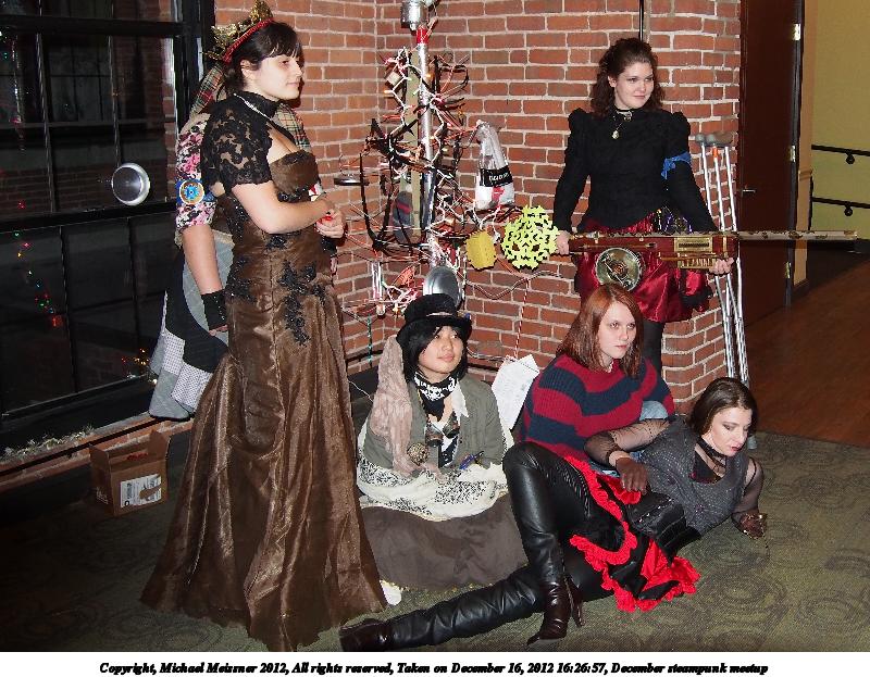 Picture #11: December steampunk meetup #11 Small: 920x713, 157,355 bytes (154K), (html file) Large: 4600x3450, 4,756,819 bytes (4.5M), (html file) Copyright, Michael Meissner 2012, All rights reserved Olympus E-PM2 camera with Olympus-m43 14-42mm-IIR f/3.5-5.6 lens f/3.5, ISO 800, flash (+0.33 flash compensation), 1/60 sec, 14.0mm, auto mode, natural color, matrix metering, IS1 (All Direction Shake IS), noise reduction auto 35mm equivalent focal length 28.0mm Programs used: crop, raw therapee Taken by Michael Meissner on December 16, 2012 15:34:21 Last modified on July 15, 2013 at 10:39 |