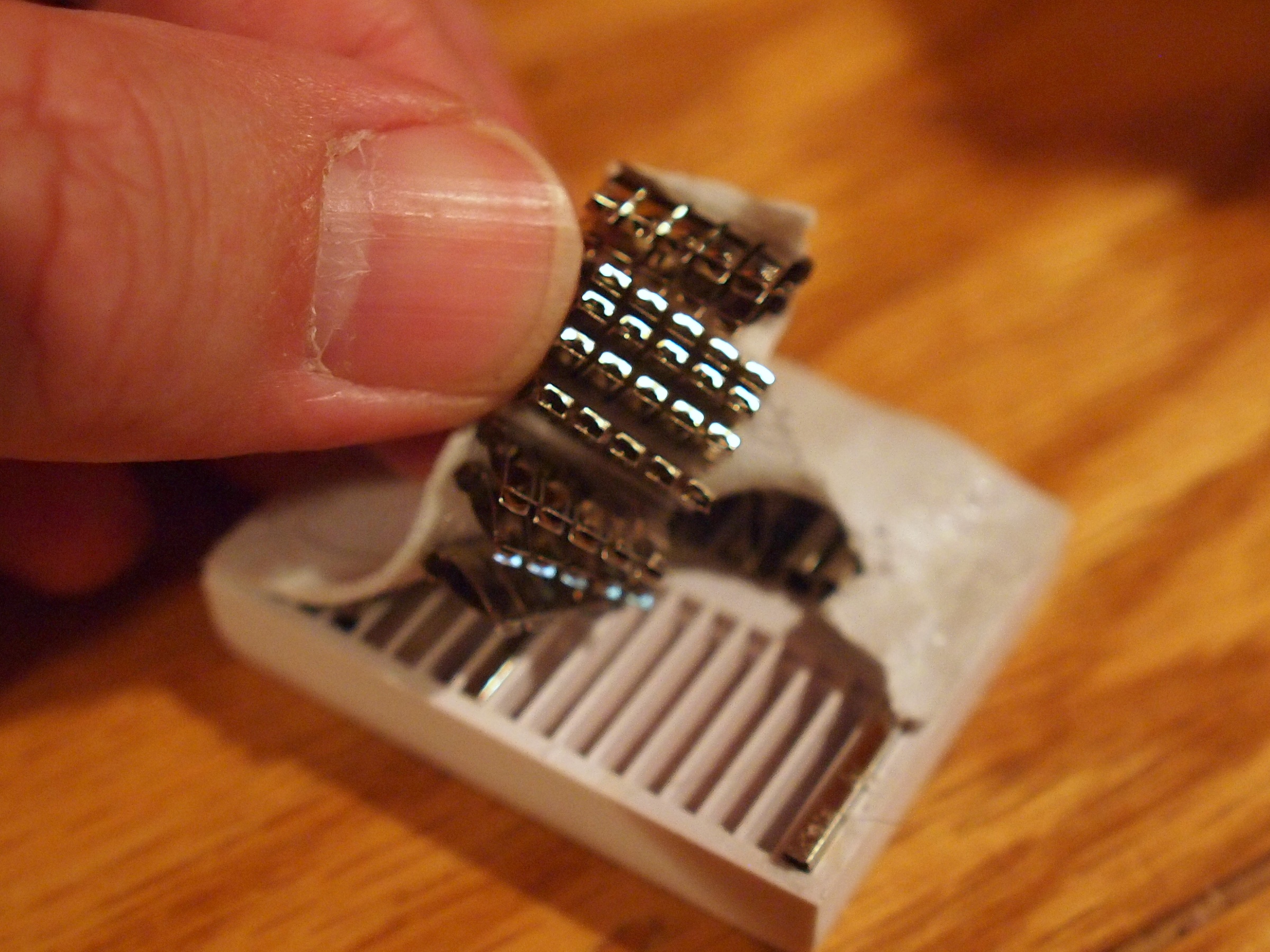 Picture #6: Breadboard adhesive too strong Small: 800x623, 62,338 bytes (61K), (html file) Large: 2400x1800, 1,057,755 bytes (1.0M), (html file) Copyright, Michael Meissner 2012, All rights reserved Olympus E-5 camera with Olympus 14-54mm f/2.8-3.5 lens f/8.0, ISO 200, flash (+0.3 flash compensation), 1/60 sec, 14.0mm, aperture priority, vivid color, matrix metering, IS1 (All Direction Shake IS) 35mm equivalent focal length 28.0mm Programs used: crop, raw therapee Taken by Michael Meissner on July 27, 2012 11:08:31 Last modified on July 27, 2012 at 11:29 I used the adhesive backing on the tiny breadboard, and then wanted to move it. The adhesive was too strong, and it ripped off the bottom of the breadboard. |